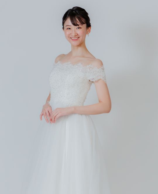 レースのオフショルダーが柔らかく肩を包み、落ち着いた裏地がやさしい空気感を演出。可憐で穏やかなムードの一着です。