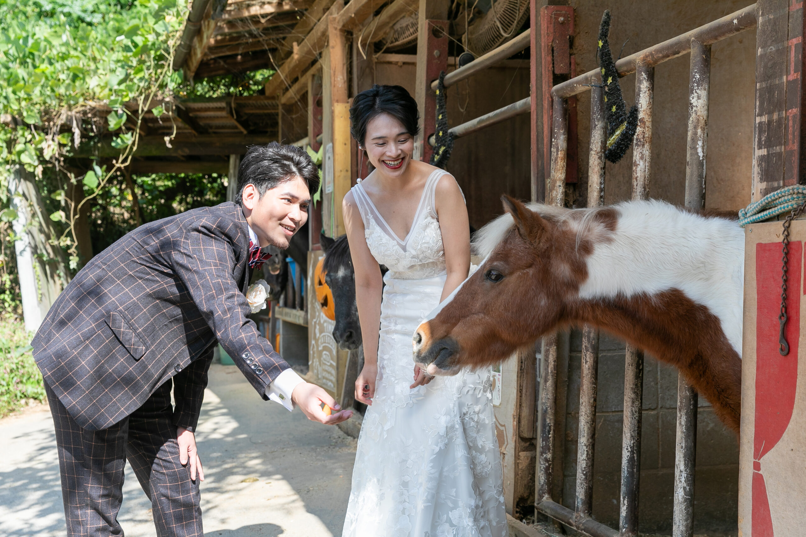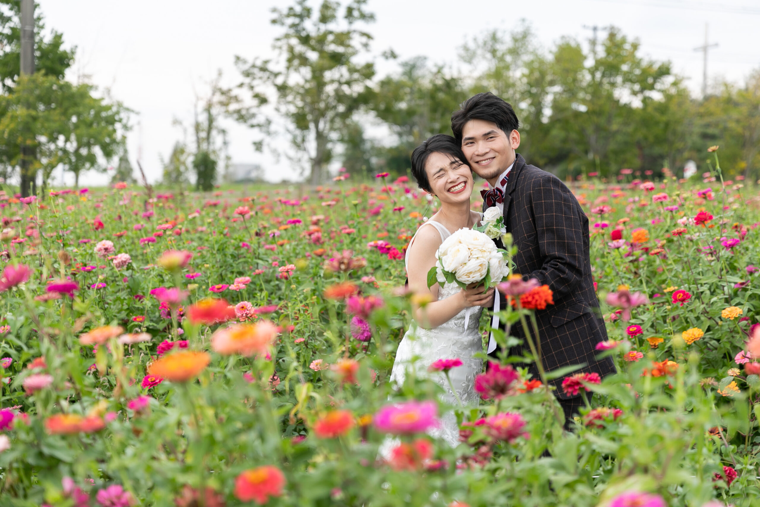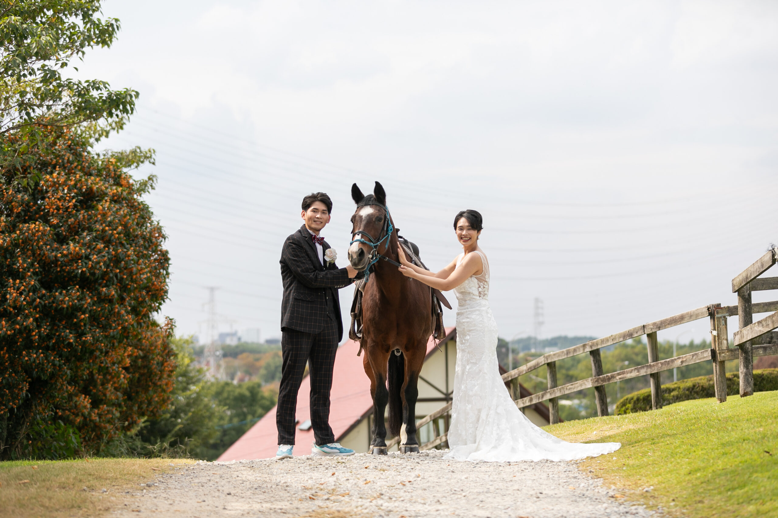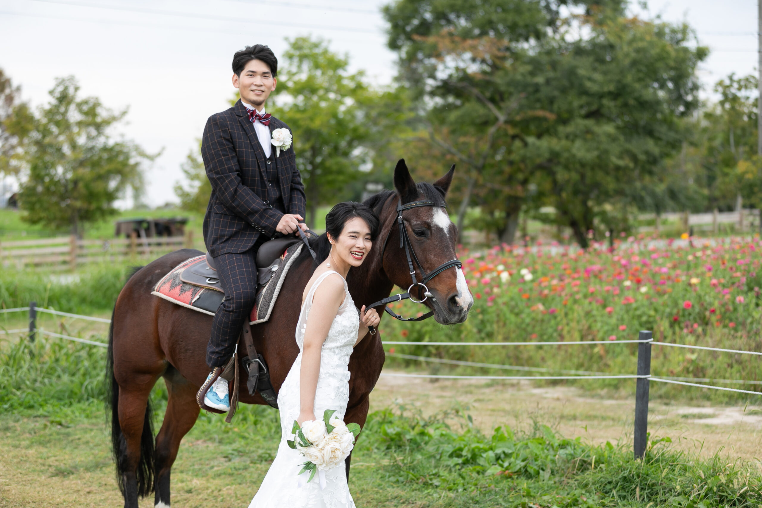 洋装ロケーション撮影では欠かせない綺麗な空と自然の緑はもちろん、季節のお花やお馬さん、動物たちとも撮影出来ちゃいます!