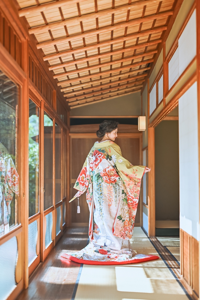 金をベースとした色味に鮮やかな緑が映える色打掛。着物の中で栄枯盛衰のストーリーが完結されているような華やかでまとまりある一着。