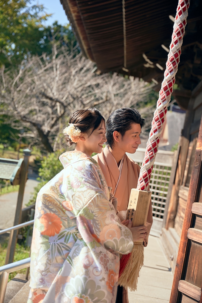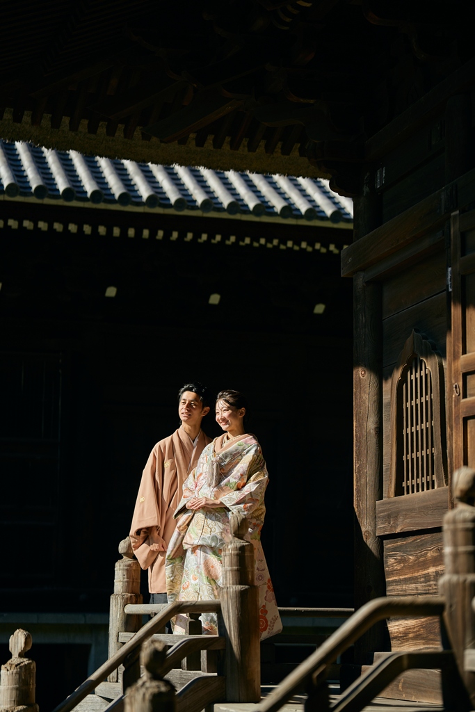 鎌倉時代に建設された由緒あるお寺での撮影。美しい細工と落ち着いた色調の庭園が調和した空間で、和の雰囲気を際立たせた一枚が叶います。