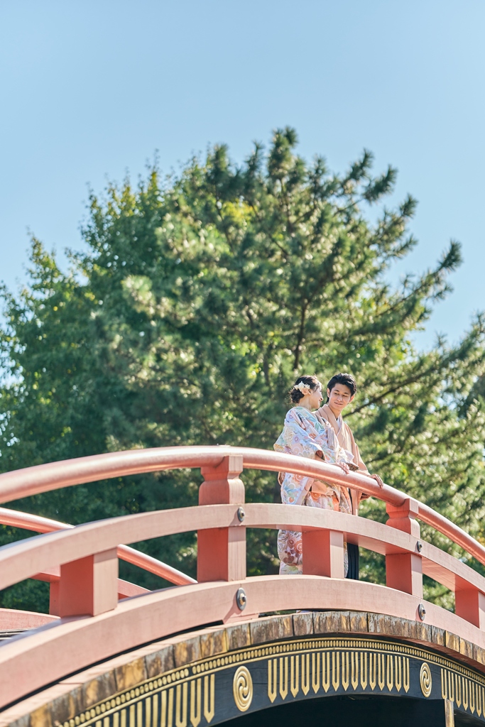 歴史的建造物と自然が一体感ある景色として融合した国内を代表する庭園。池のほとりから五重塔をバックにした写真や、石橋・灯篭といった和装ならではの背景も揃い歴史と触れ合う撮影が叶います。