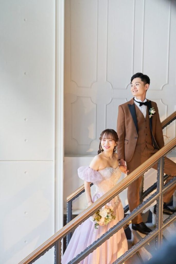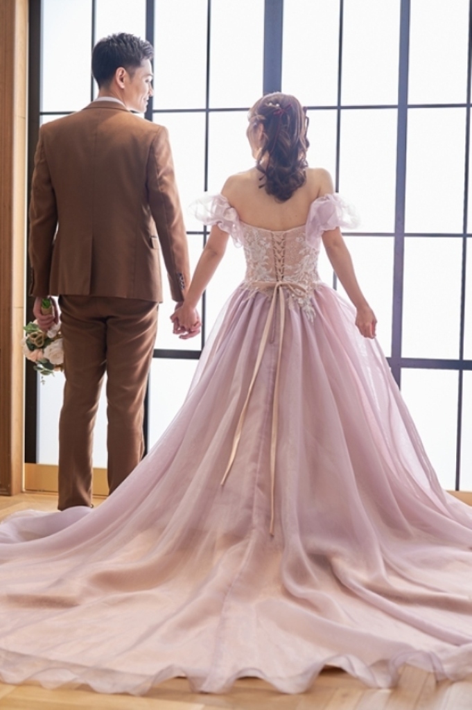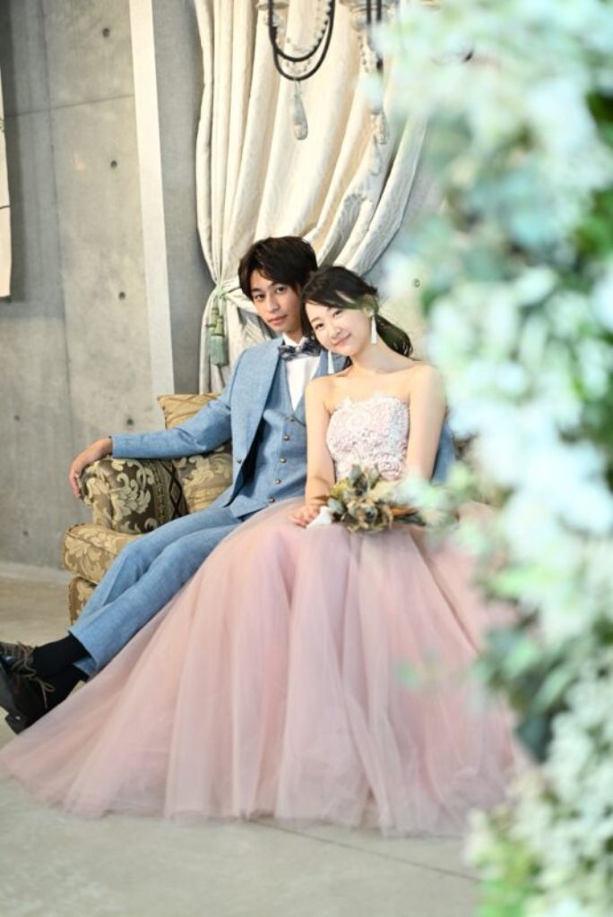 優しいスモークピンクは可愛らしさと大人っぽさを兼ね備えたカラー。デニムタキシードを合わせれば、カジュアルでポップな雰囲気に。等身大の結婚写真を撮りたいカップルにおすすめです。