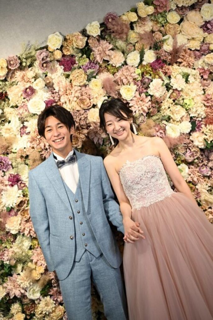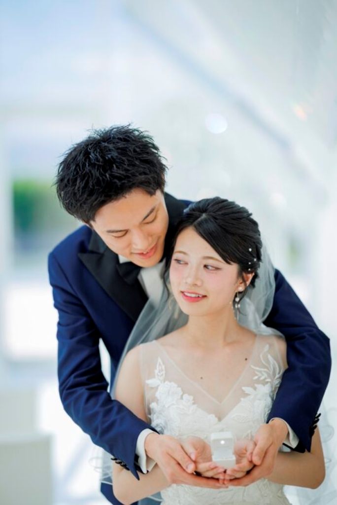 華やかな刺繡が写真映えするAラインドレス。ネイビータキシードで知的な印象をプラスすれば、クラシカルとモダンが調和した王道スタイルに。