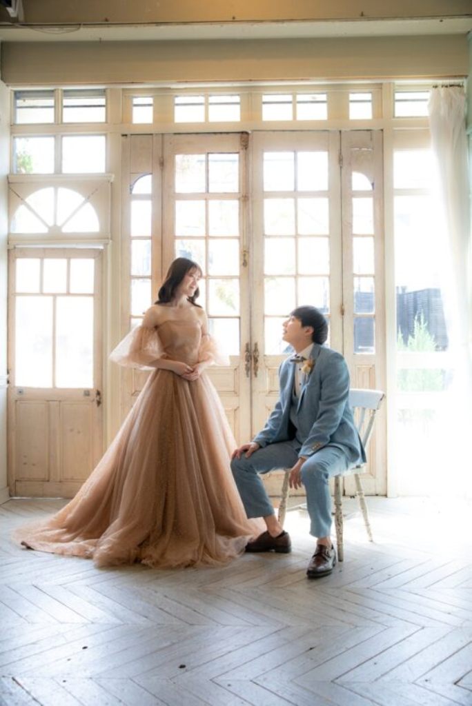 温かみのあるブラウンベージュは肌馴染み抜群で上品な印象。ブルータキシードと組み合わせると、都会的で爽やかな前撮り写真が完成します。