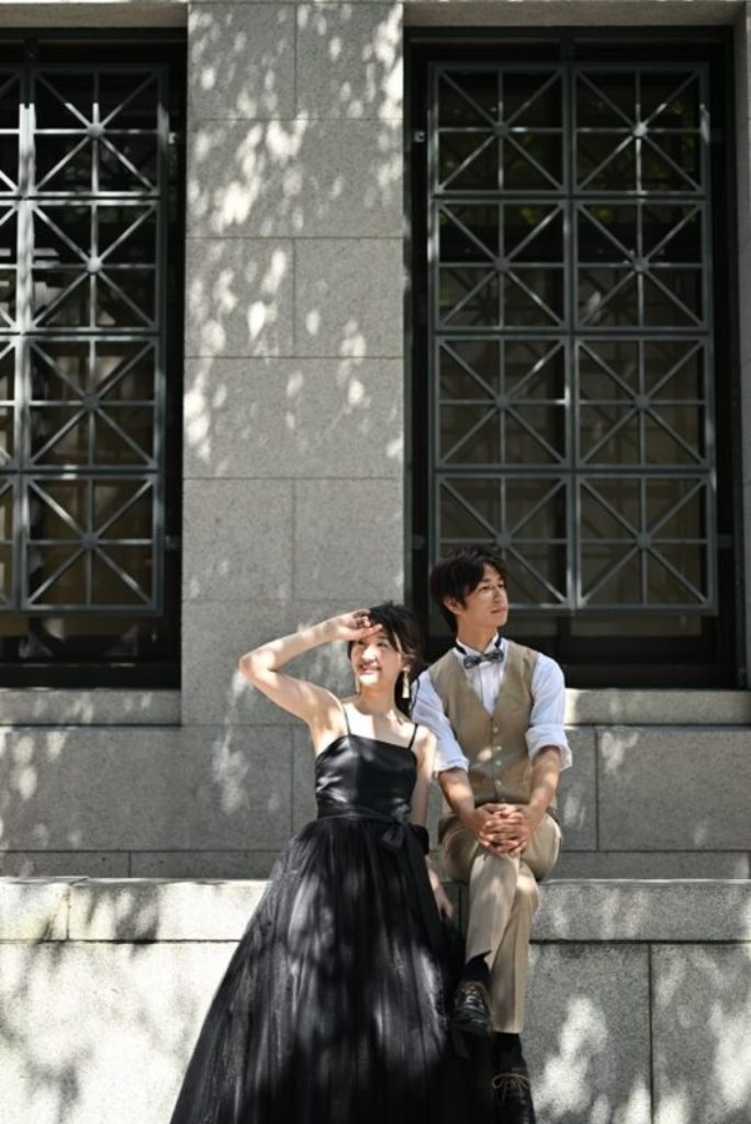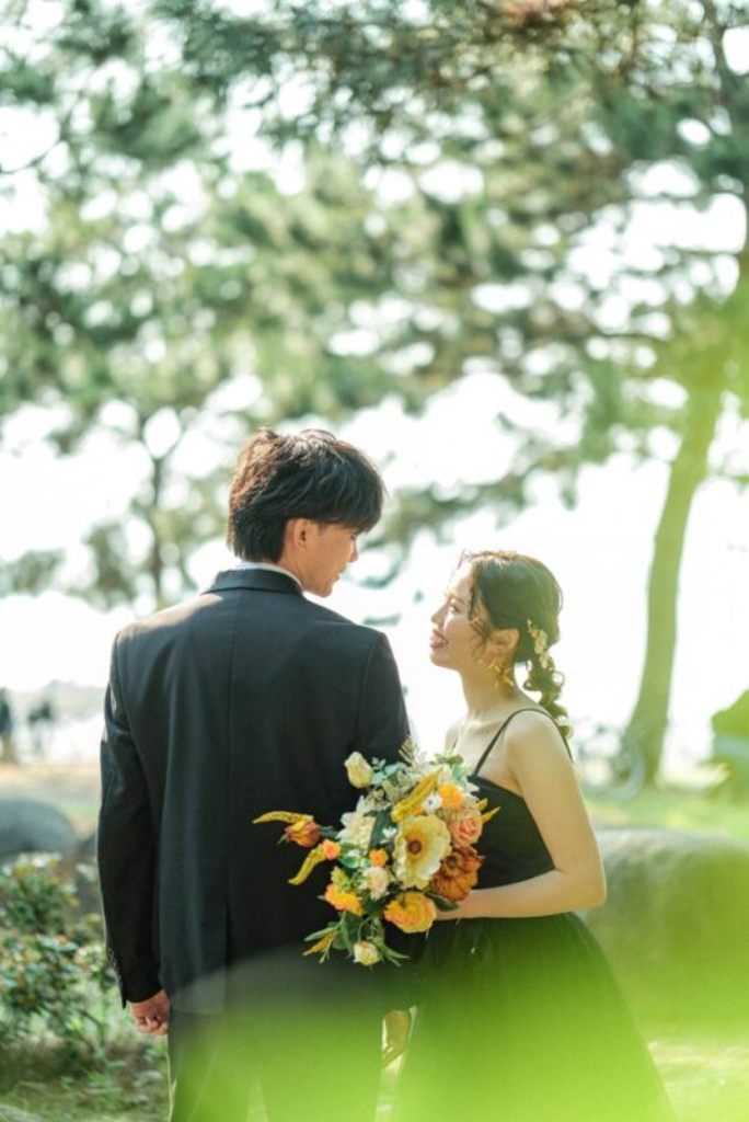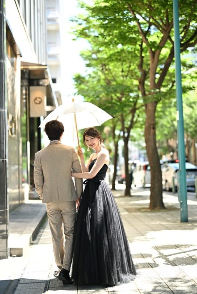 大人花嫁に人気のシックなブラックドレス。新郎も同色のタキシードで揃えることで、統一感のあるドラマティックな前撮り写真に。シンプルながら存在感抜群で、アートのような結婚写真を求めるカップルに最適です。