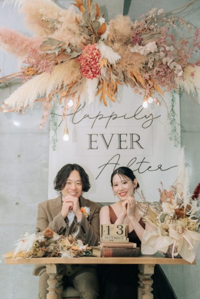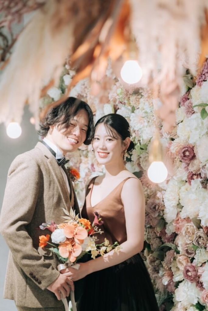 同系色で揃えたブラウンコーデは、落ち着きと温かみを兼ね備えます。ナチュラルなウッド調の背景にぴったりで、季節を問わず前撮りにおすすめです。