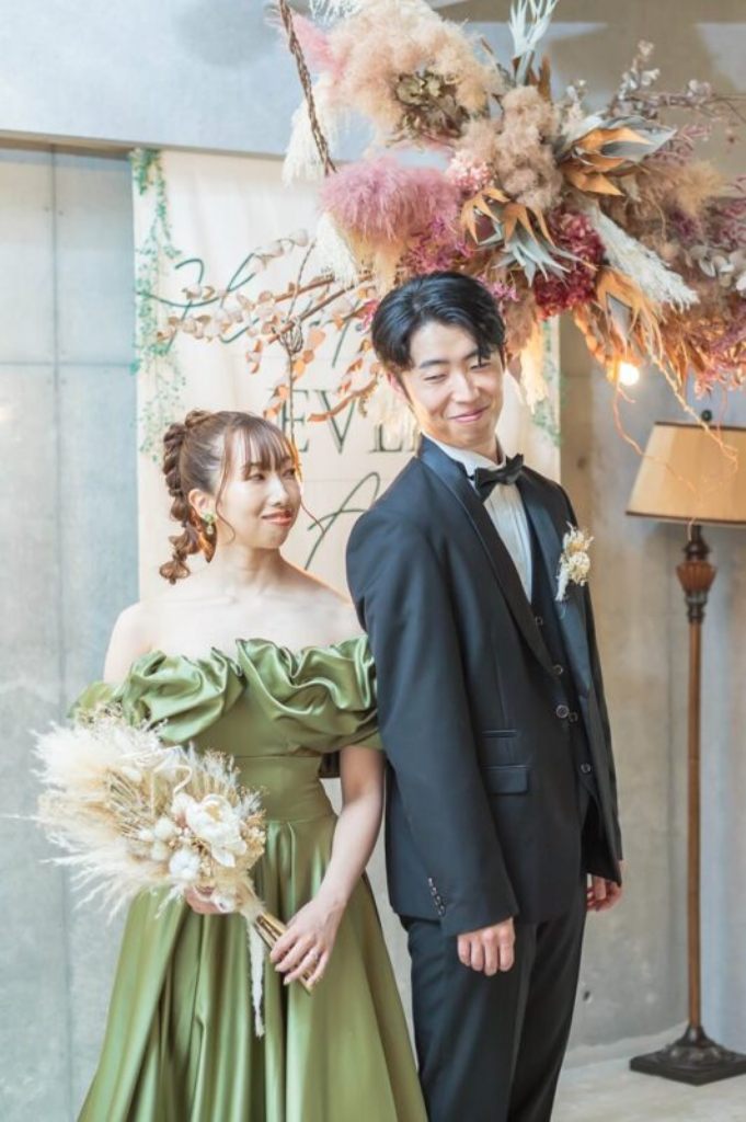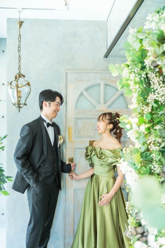 同系色のリンクコーデで統一感を演出。落ち着きと個性を兼ね備えたモスグリーンは、自然や緑を背景にした前撮り写真に最適。季節を問わず取り入れやすいナチュラルスタイルです。