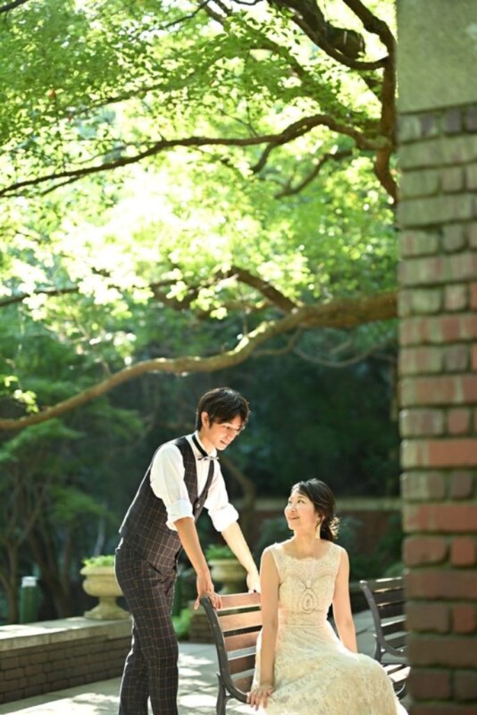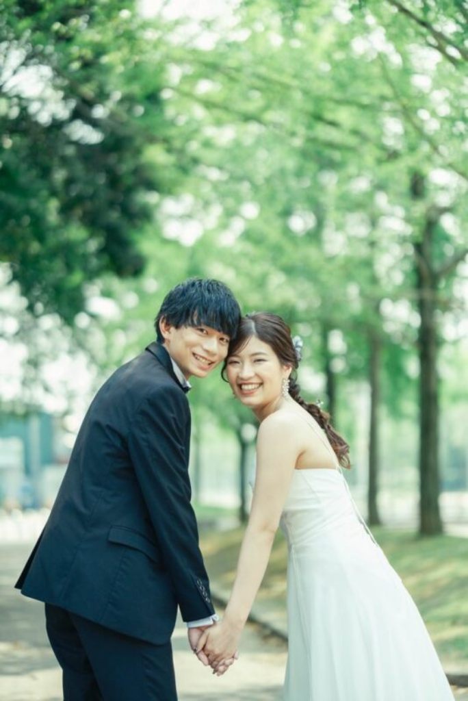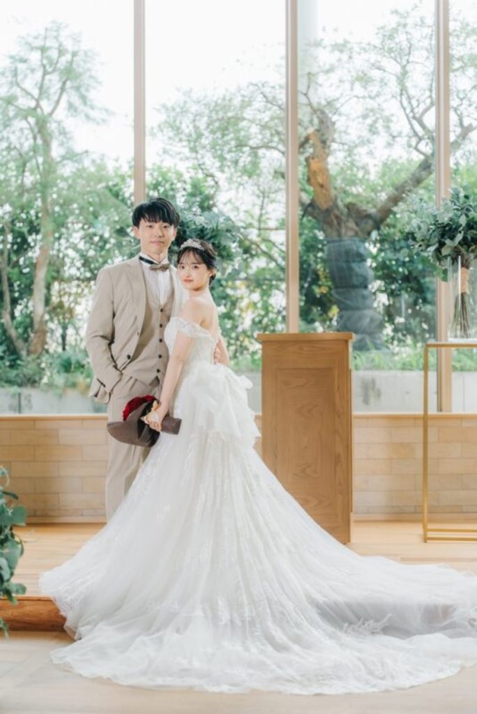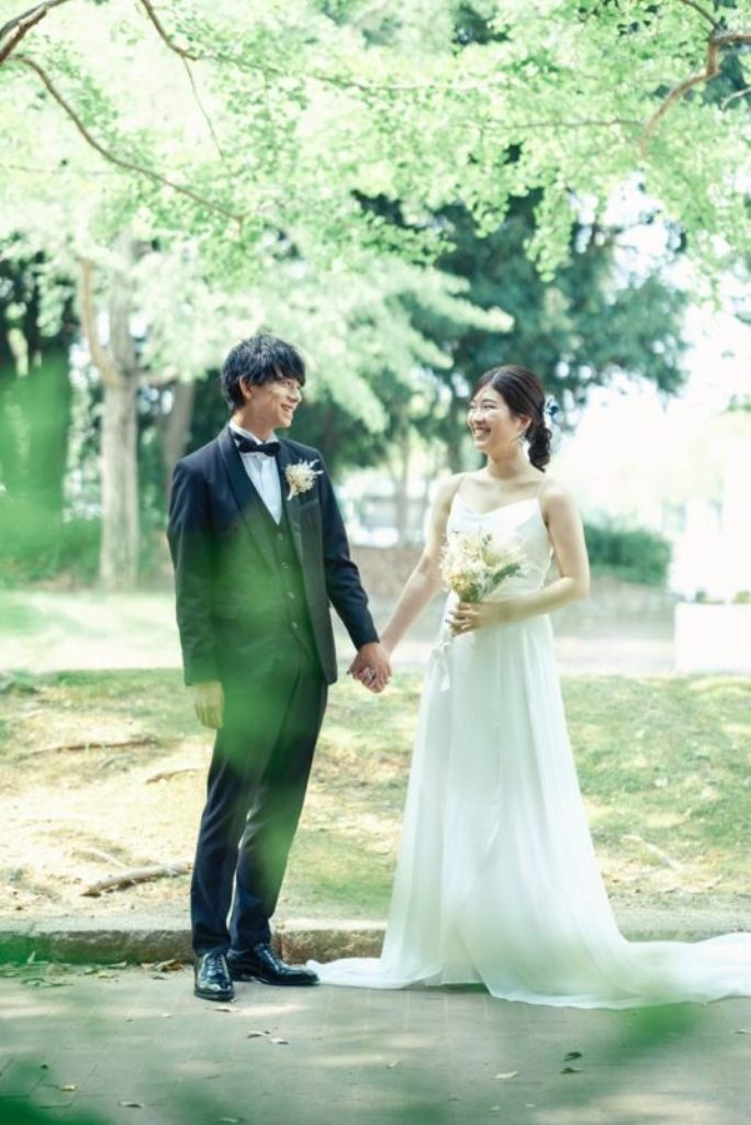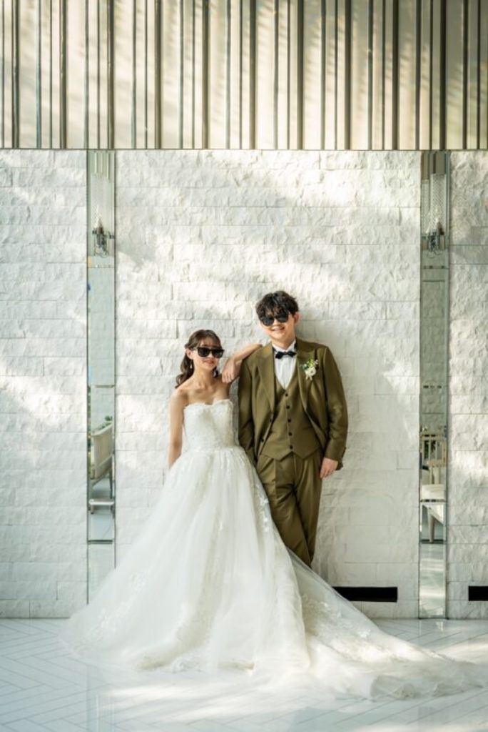 清楚で可憐な印象を与えるAラインドレスには、カーキのタキシードを合わせるとナチュラルで都会的なモード感がプラスされます。ガーデン撮影や自然光あふれるスタジオ撮影におすすめの爽やか前撮りコーデです。