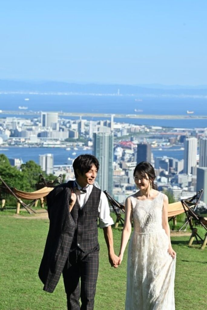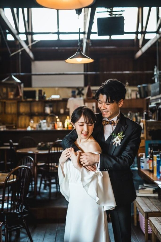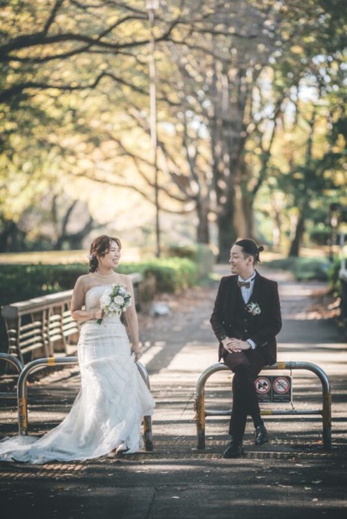 柔らかい素材感のオフショルダードレスは、カジュアルさと女性らしさを演出。ブラックフォーマルタキシードで全体を引き締めることで、洗練された大人の雰囲気に。動きのあるポーズにも映える前撮りコーデです。