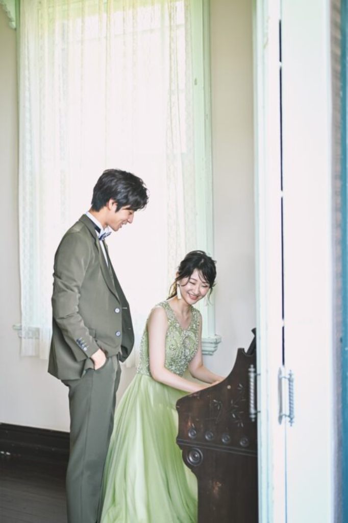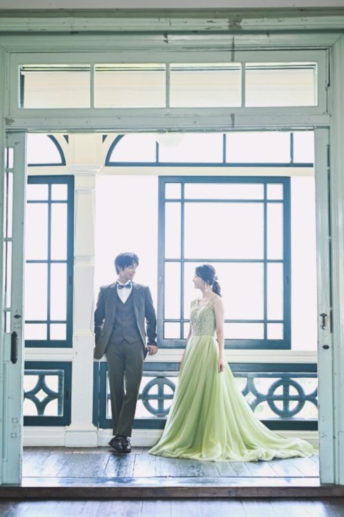 上品で爽やかなアーモンドグリーンにブラックタキシードを組み合わせると、全体が引き締まり大人っぽい雰囲気に。クラシカルな洋装撮影に華を添えるコーデです。
