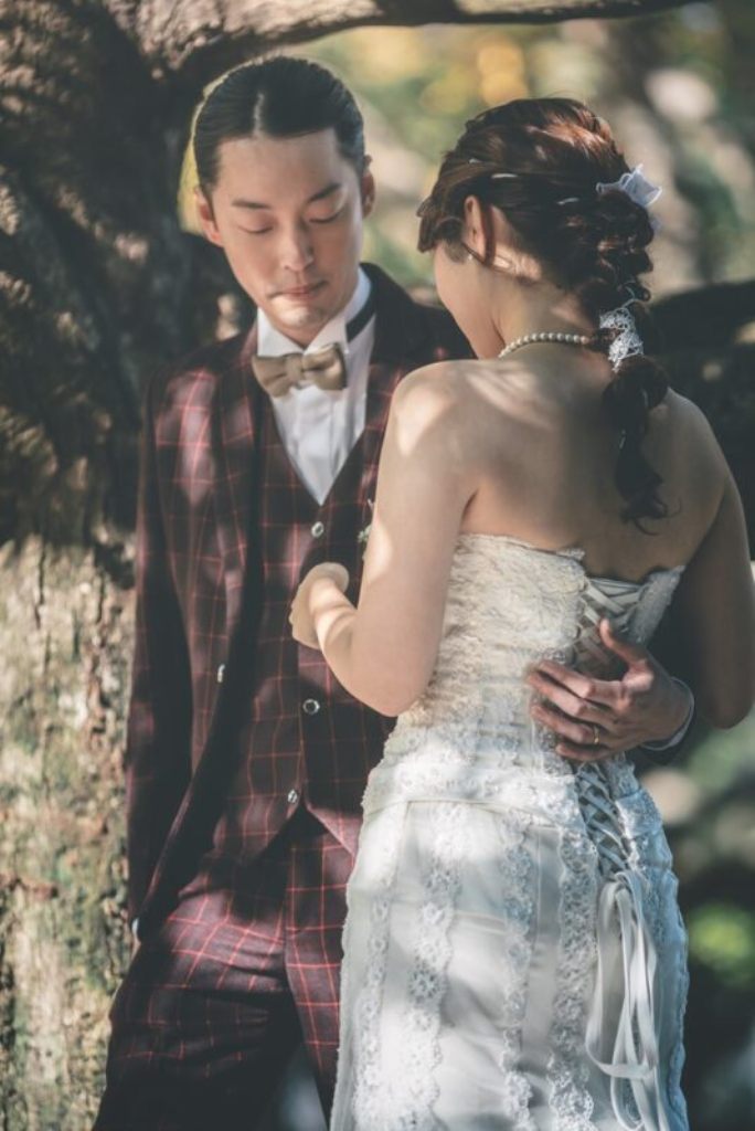 繊細なレースが可憐なカジュアルドレス。ブラックチェックのタキシードと合わせることで、格式ばらないおしゃれな雰囲気に。自然体のフォトウェディングを希望するカップルにおすすめです。