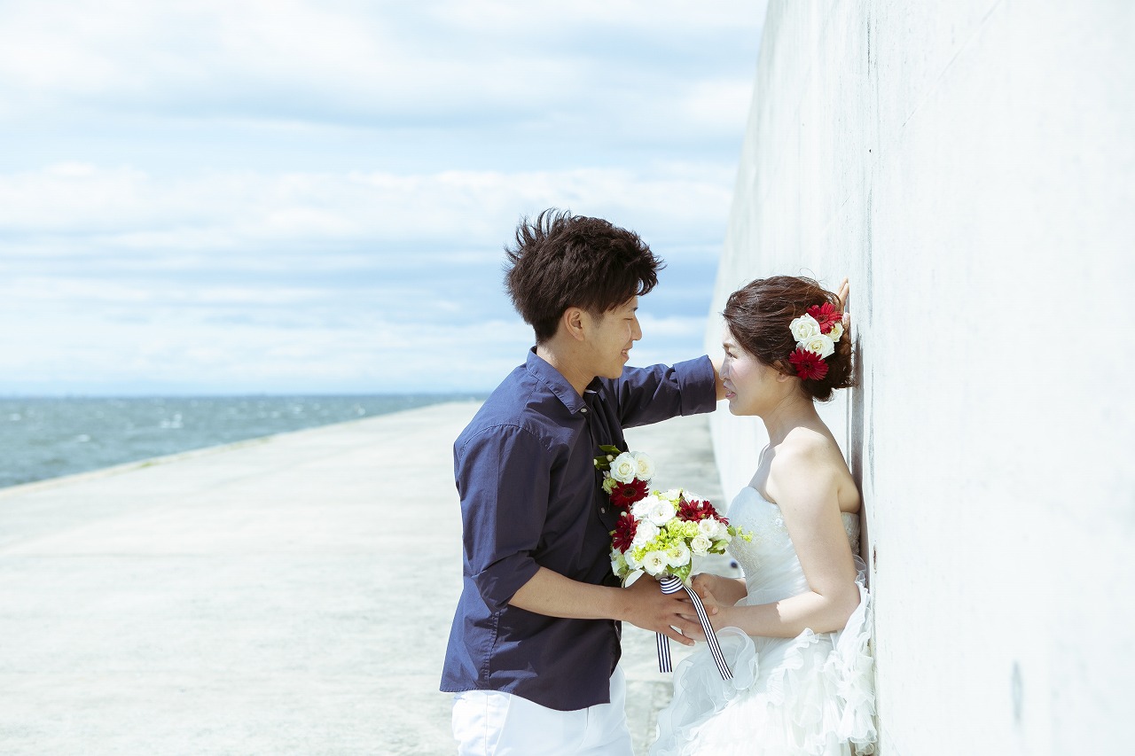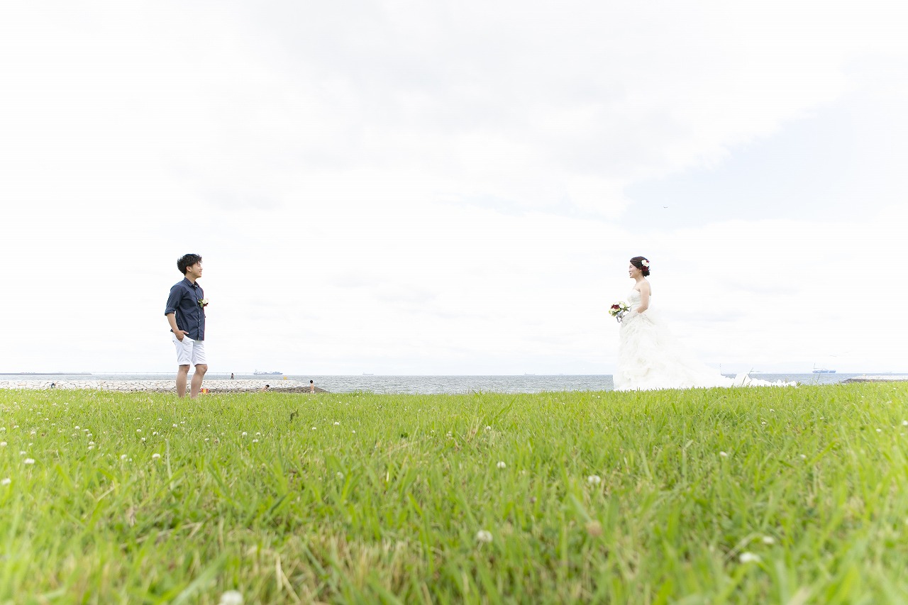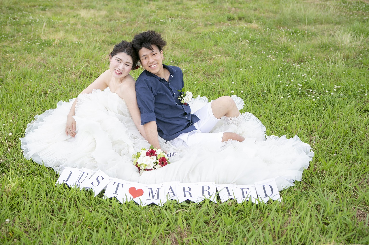 太陽と青空の下で爽やかなお写真がお撮りいただけました♡ふんわりとしたドレスがご新婦様のやさしい雰囲気にピッタリですね!