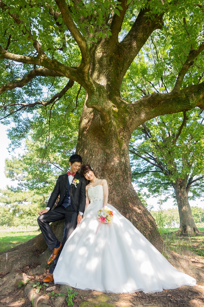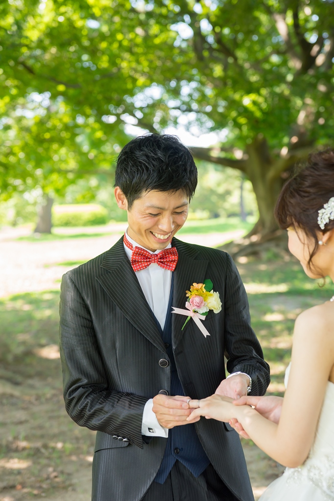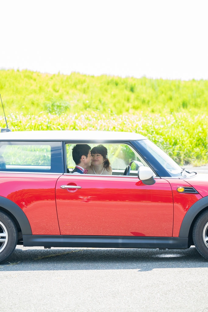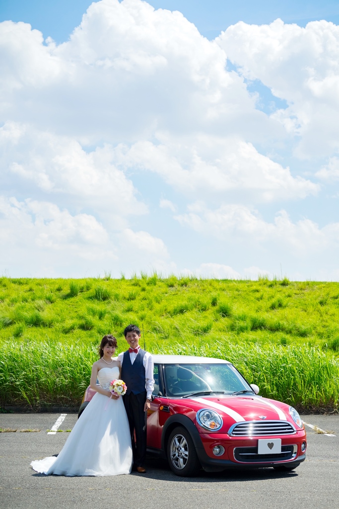 庄内緑地公園での撮影、最高のお天気でしたね☆ご新郎様の愛車の赤と蝶ネクタイのリンクコーデもすごく素敵でした!