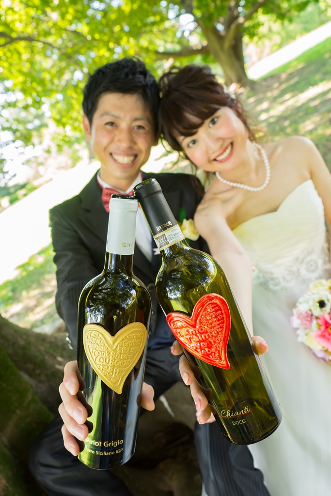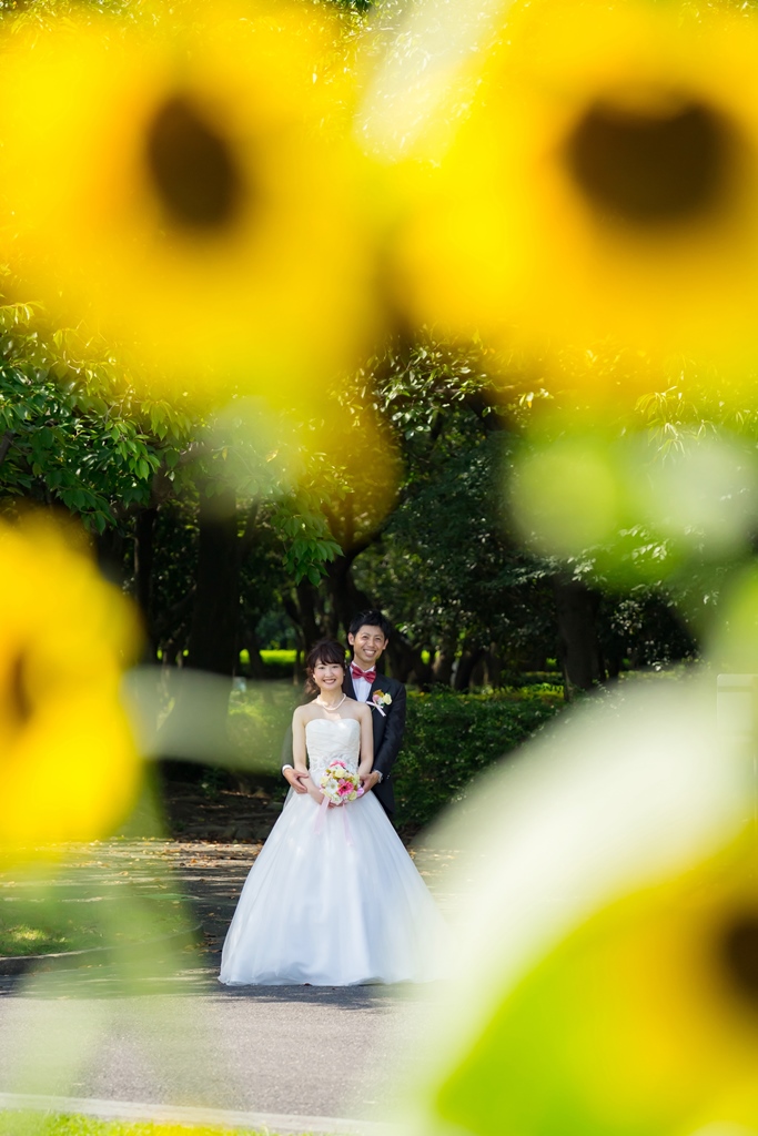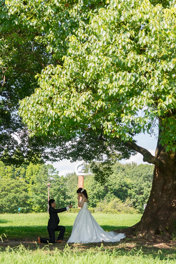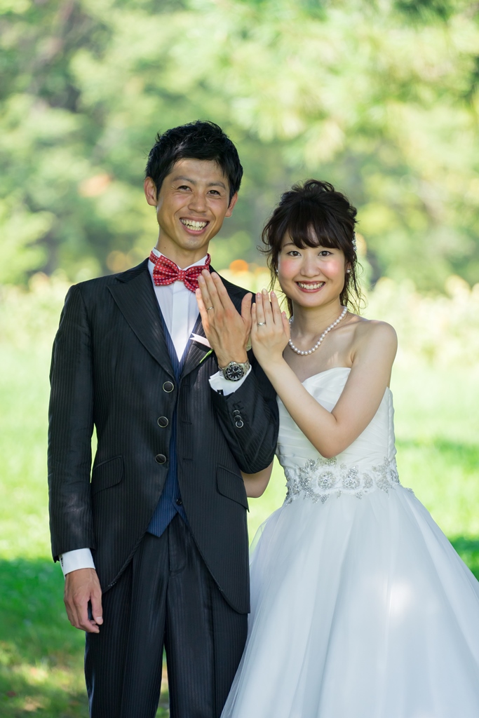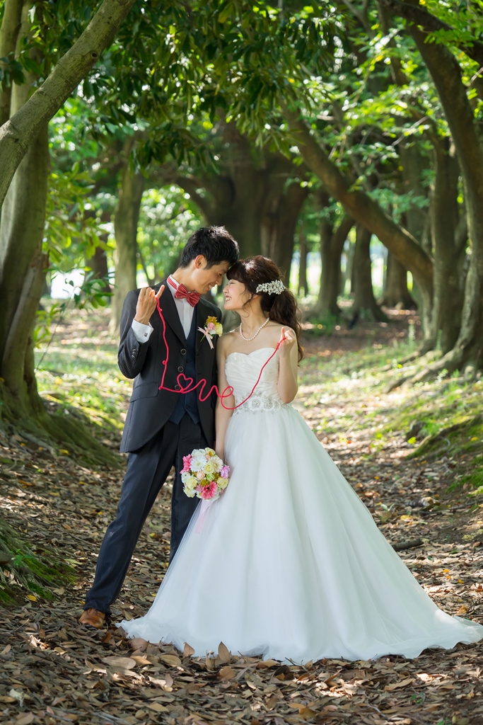 庄内緑地公園での撮影、最高のお天気でしたね☆ご新郎様の愛車の赤と蝶ネクタイのリンクコーデもすごく素敵でした!