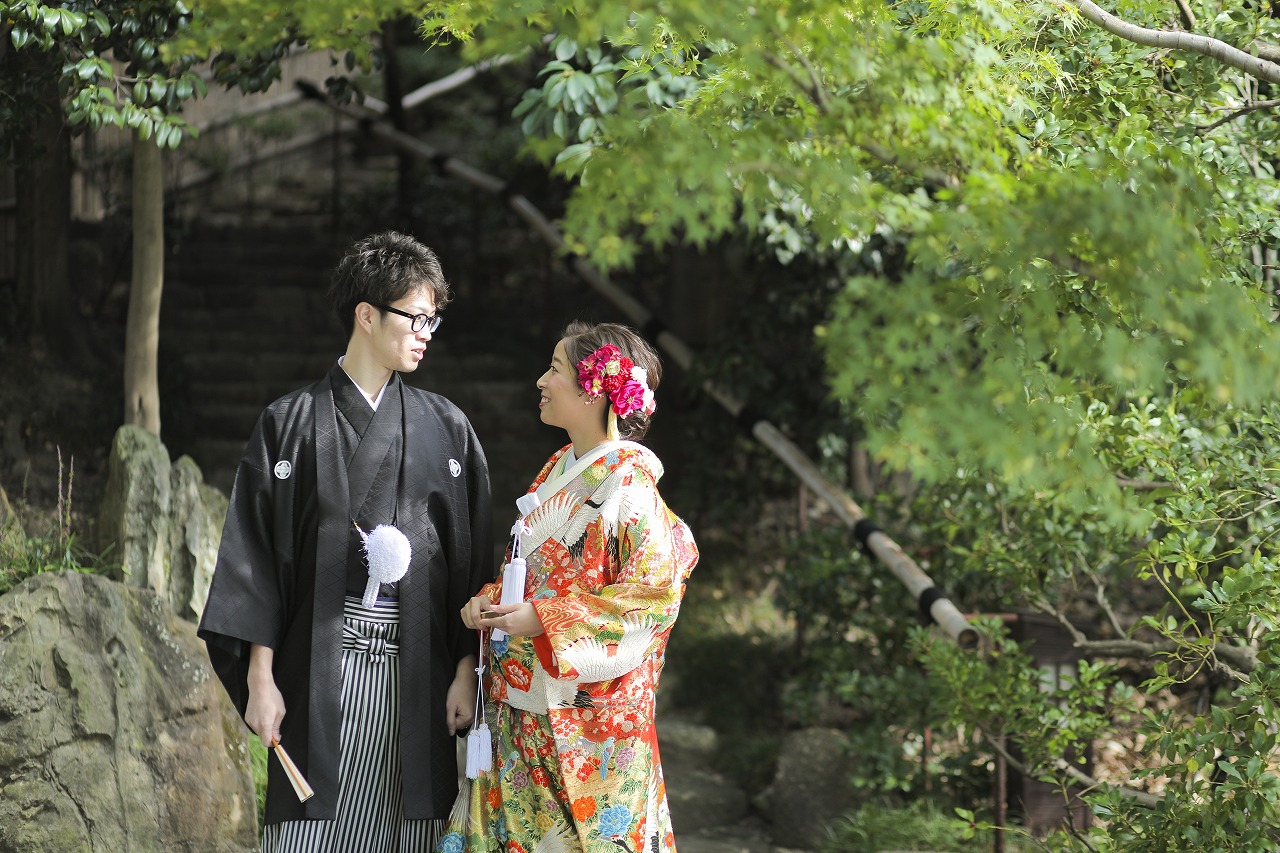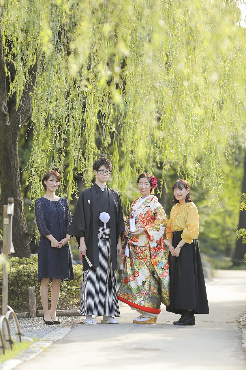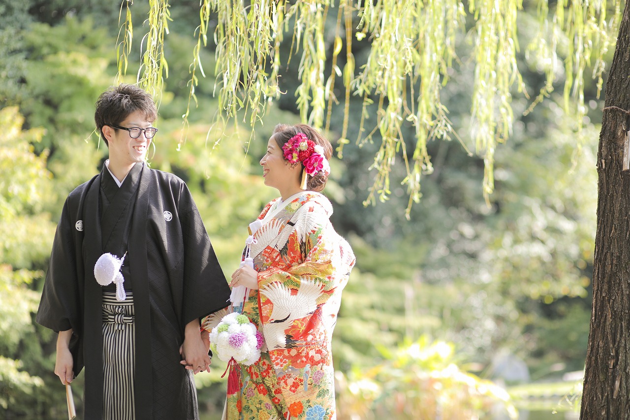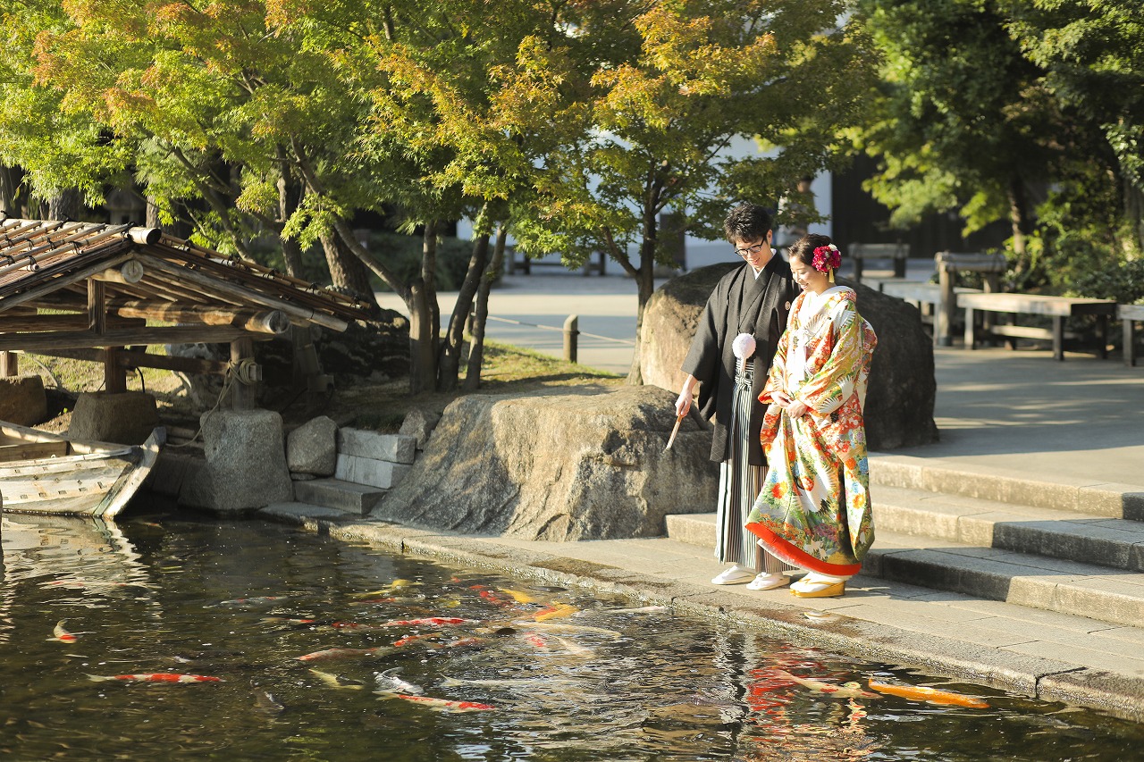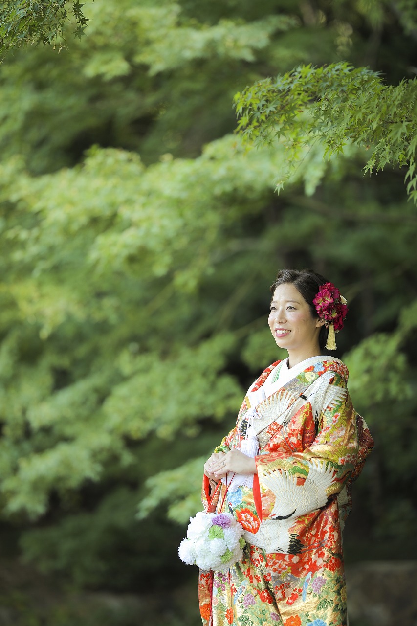 紅葉が色づく少し前に、徳川園にて前撮り撮影をして頂きました。葉が少しずつ黄色に染まっていて、とっても哀愁漂う雰囲気で良かったです。