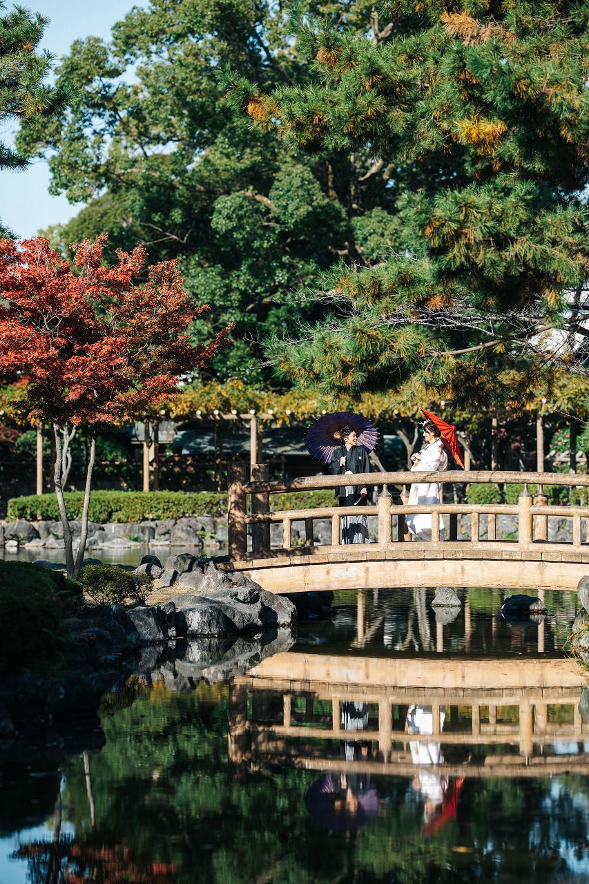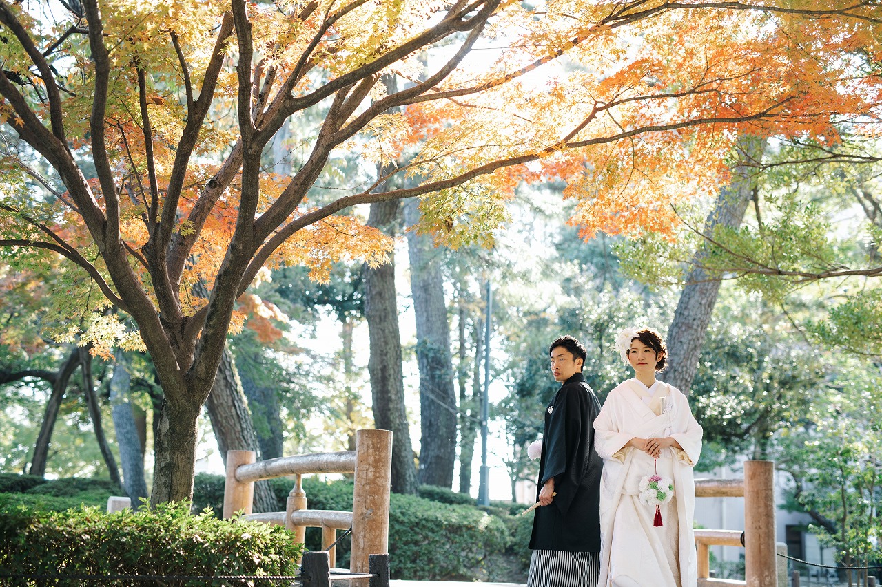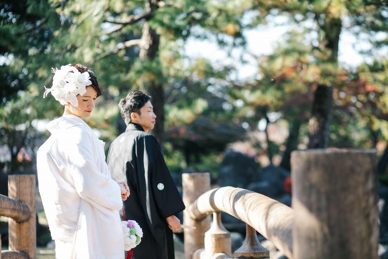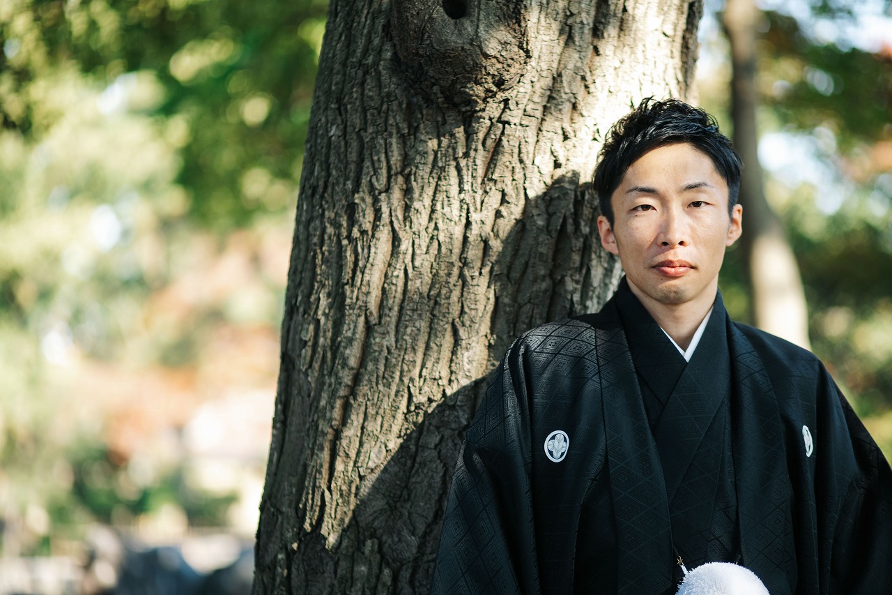 ご新郎様は、黒色の紋服をお選び頂きました。中村公園の桐蔭茶席でのあたたかい撮影や、橋、池など沢山のスポットで移動しながらの撮影ありがとうございました。