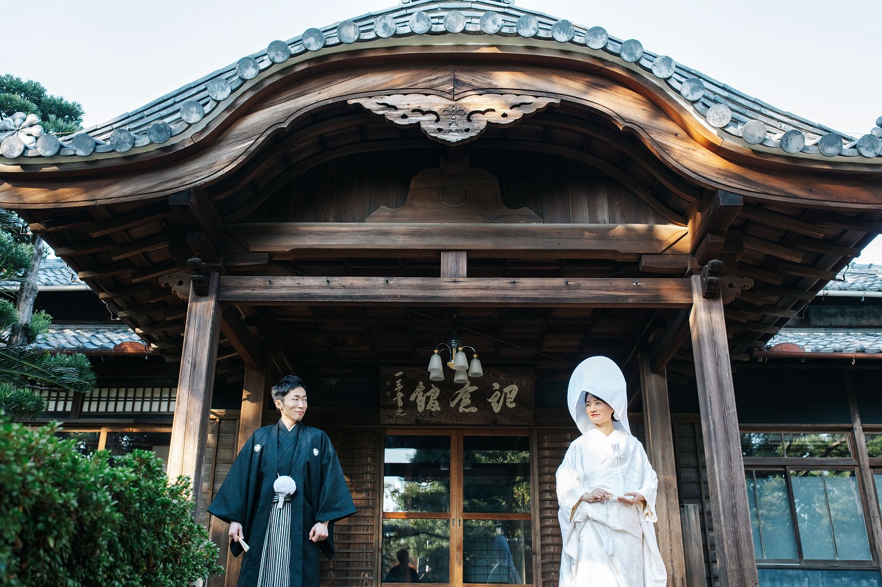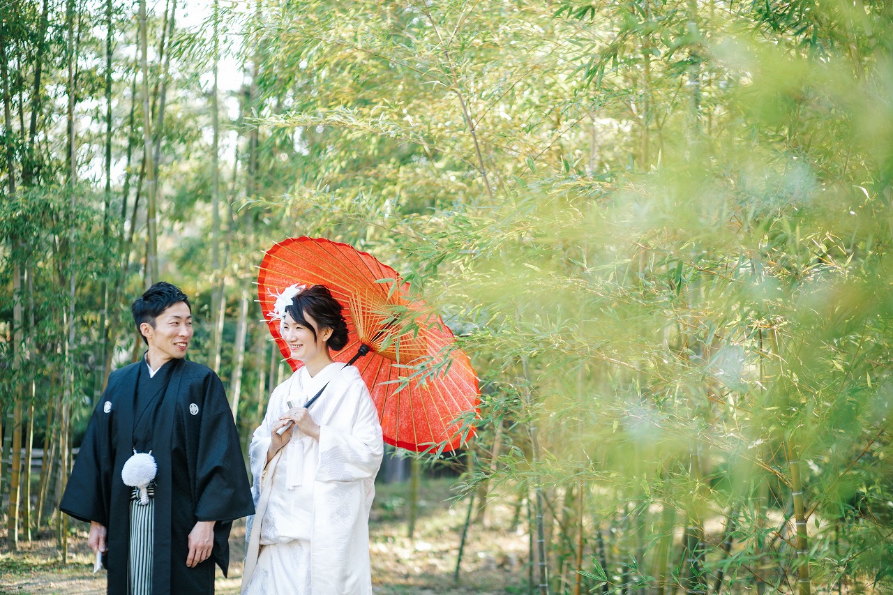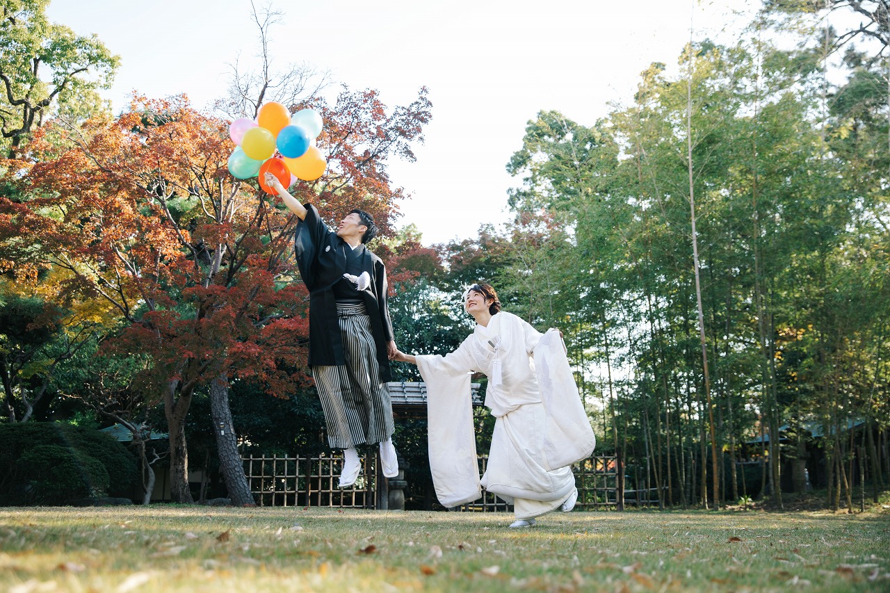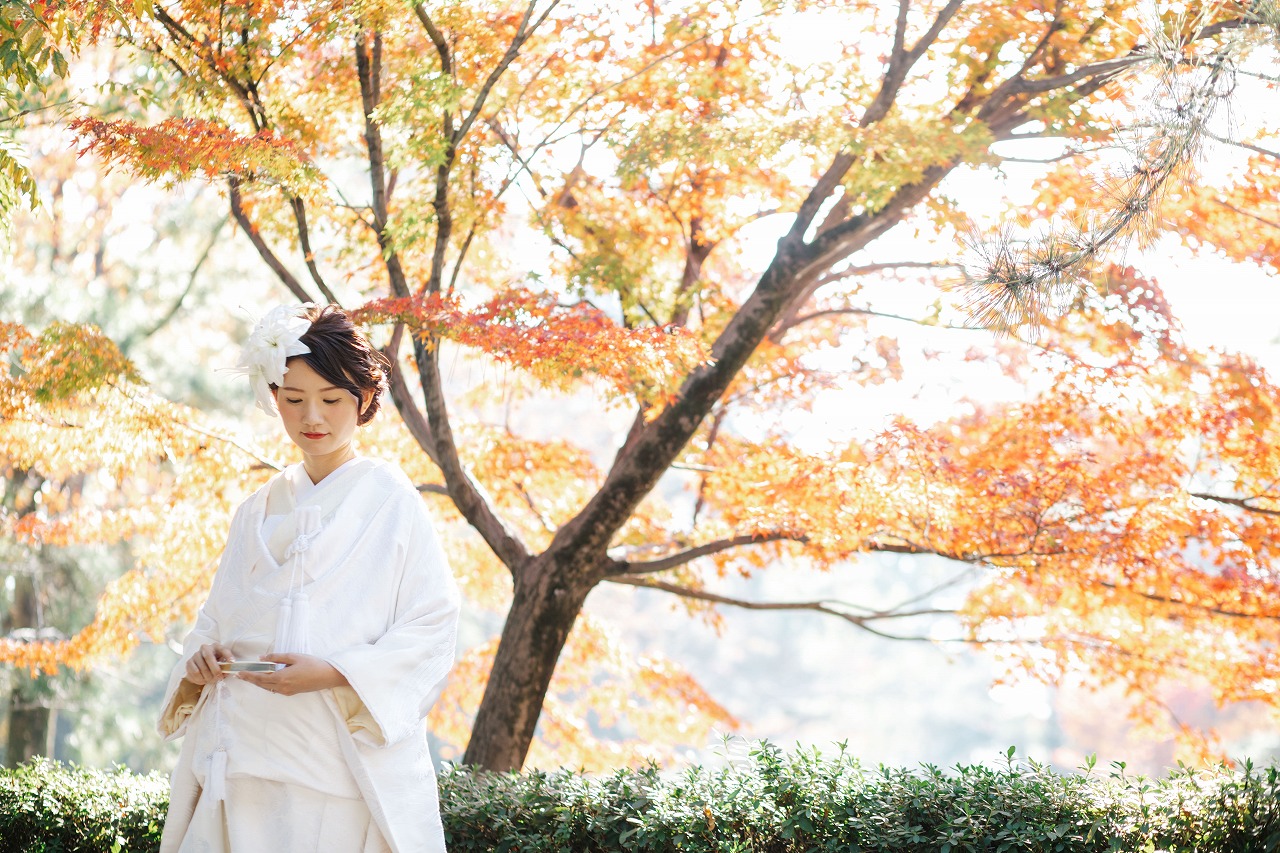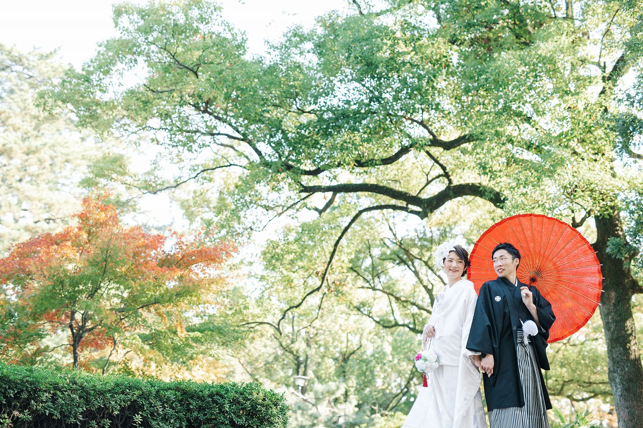 ご新郎様は、黒色の紋服をお選び頂きました。中村公園の桐蔭茶席でのあたたかい撮影や、橋、池など沢山のスポットで移動しながらの撮影ありがとうございました。