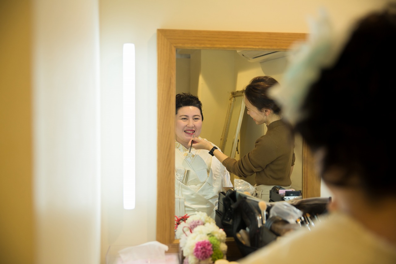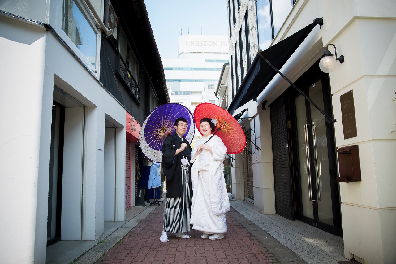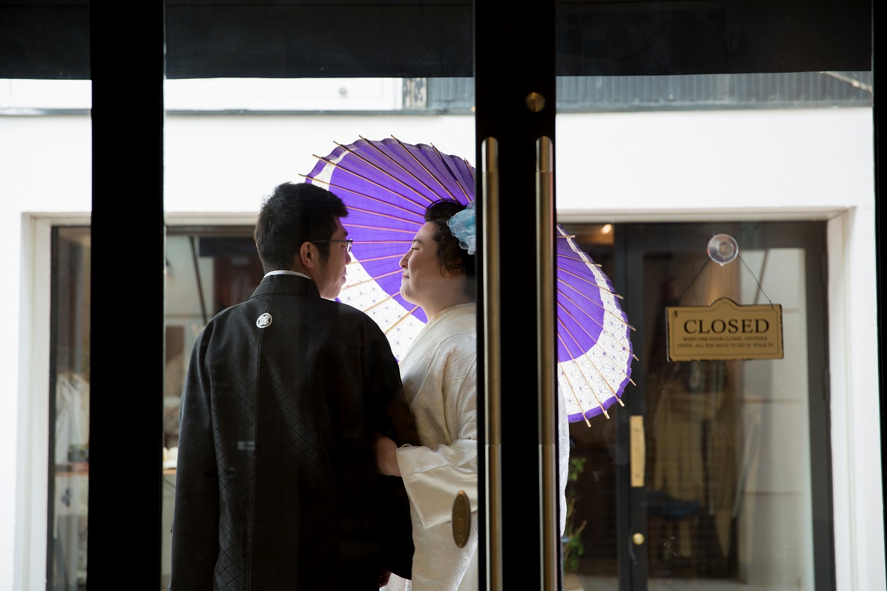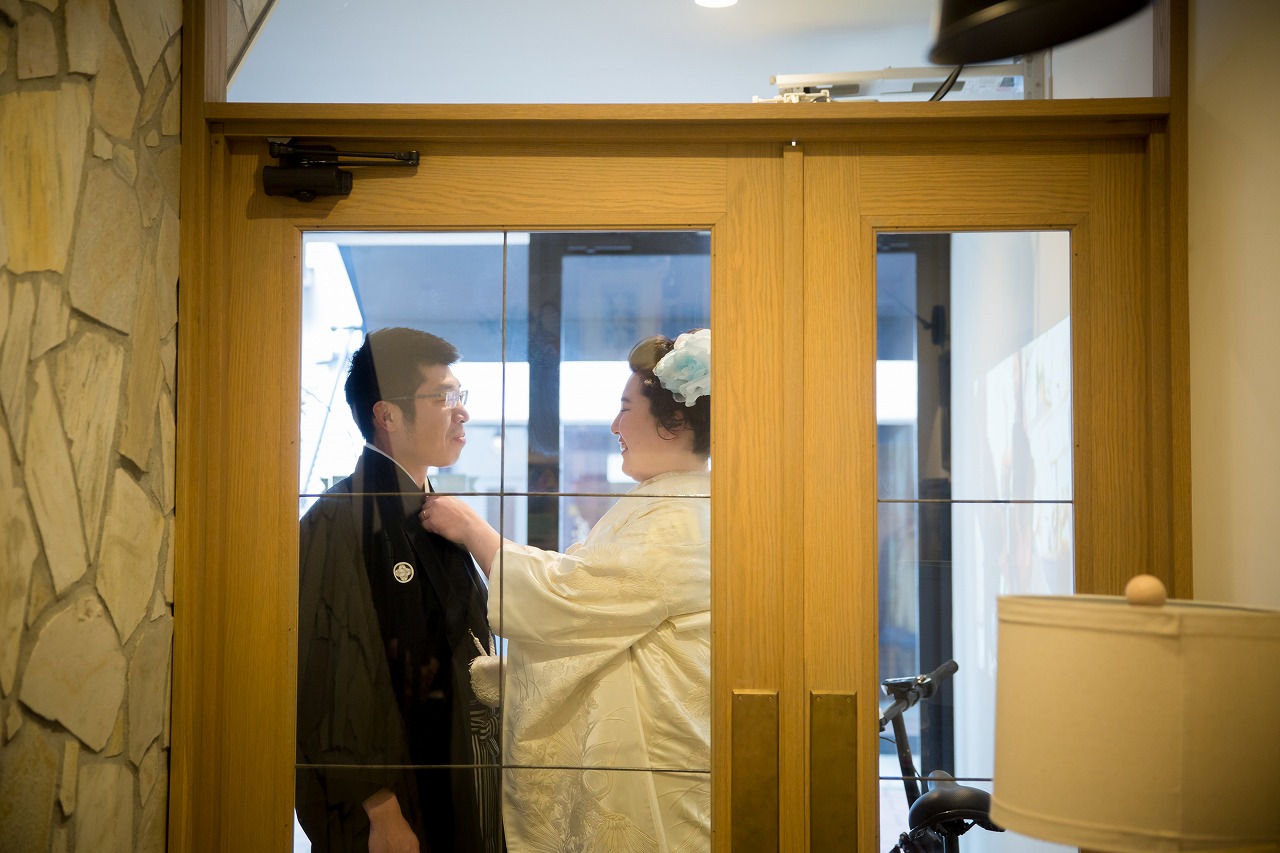 ご新婦様の爽やかな白無垢とご新郎様の紋服で