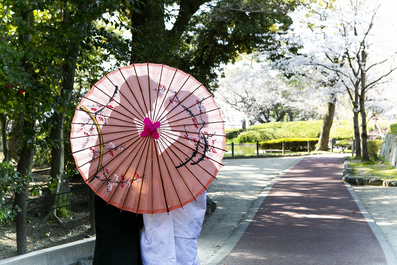 真っ白な白無垢と淡いピンクの桜とのお写真で