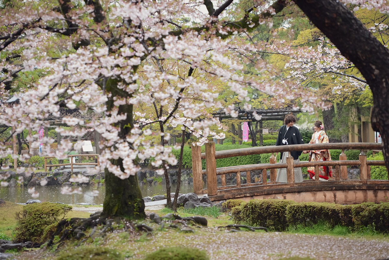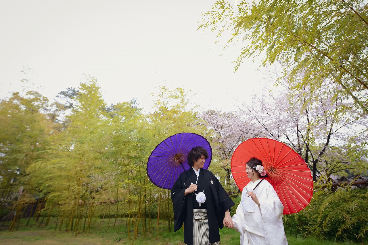 桜の木の下でにっこり楽しい和装ウェディングフォト♡