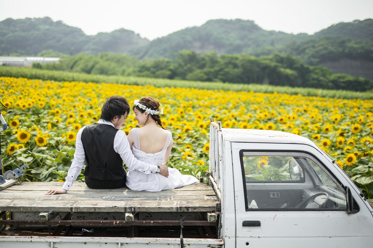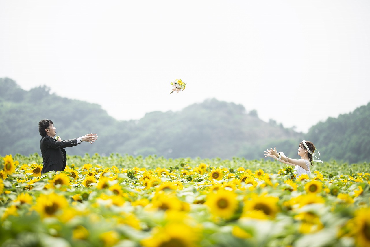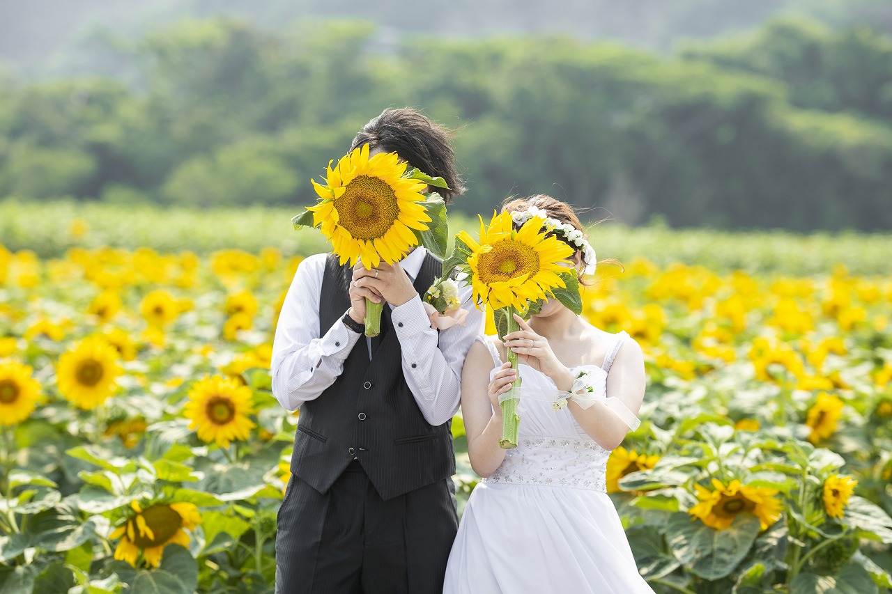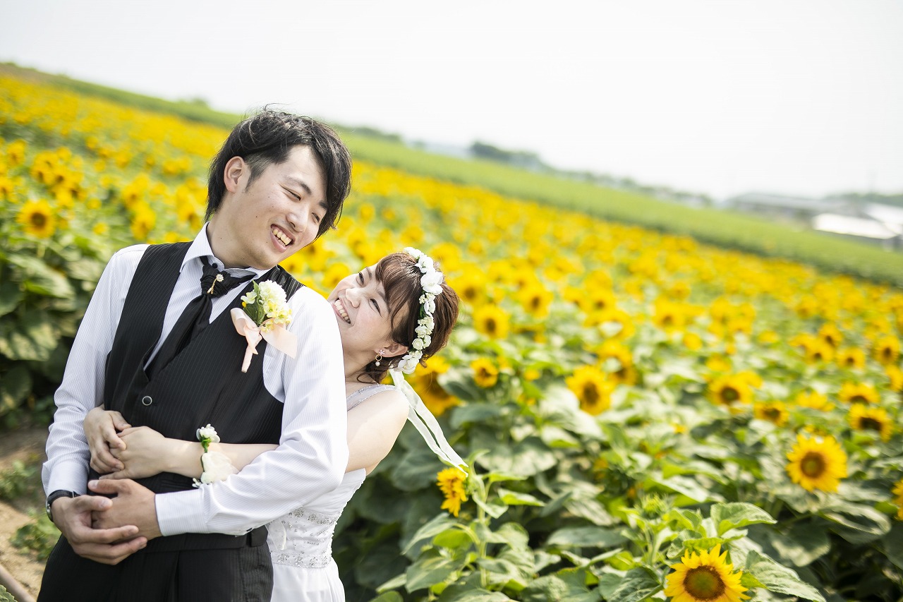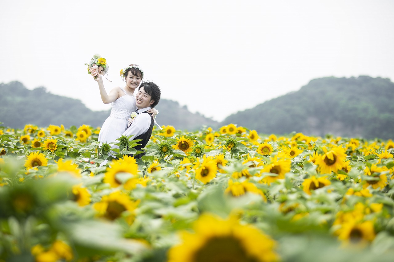 一面黄色のひまわり畑で可愛すぎるウェディングフォト♡