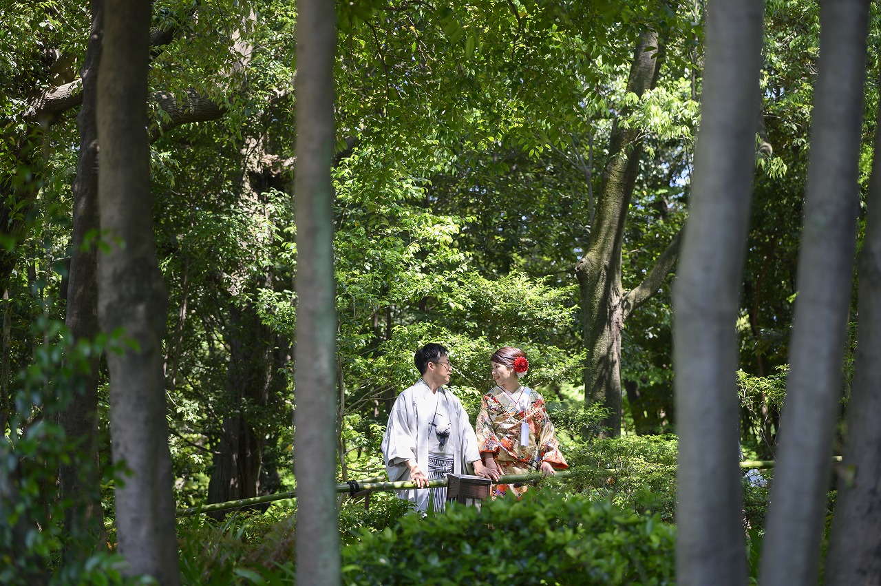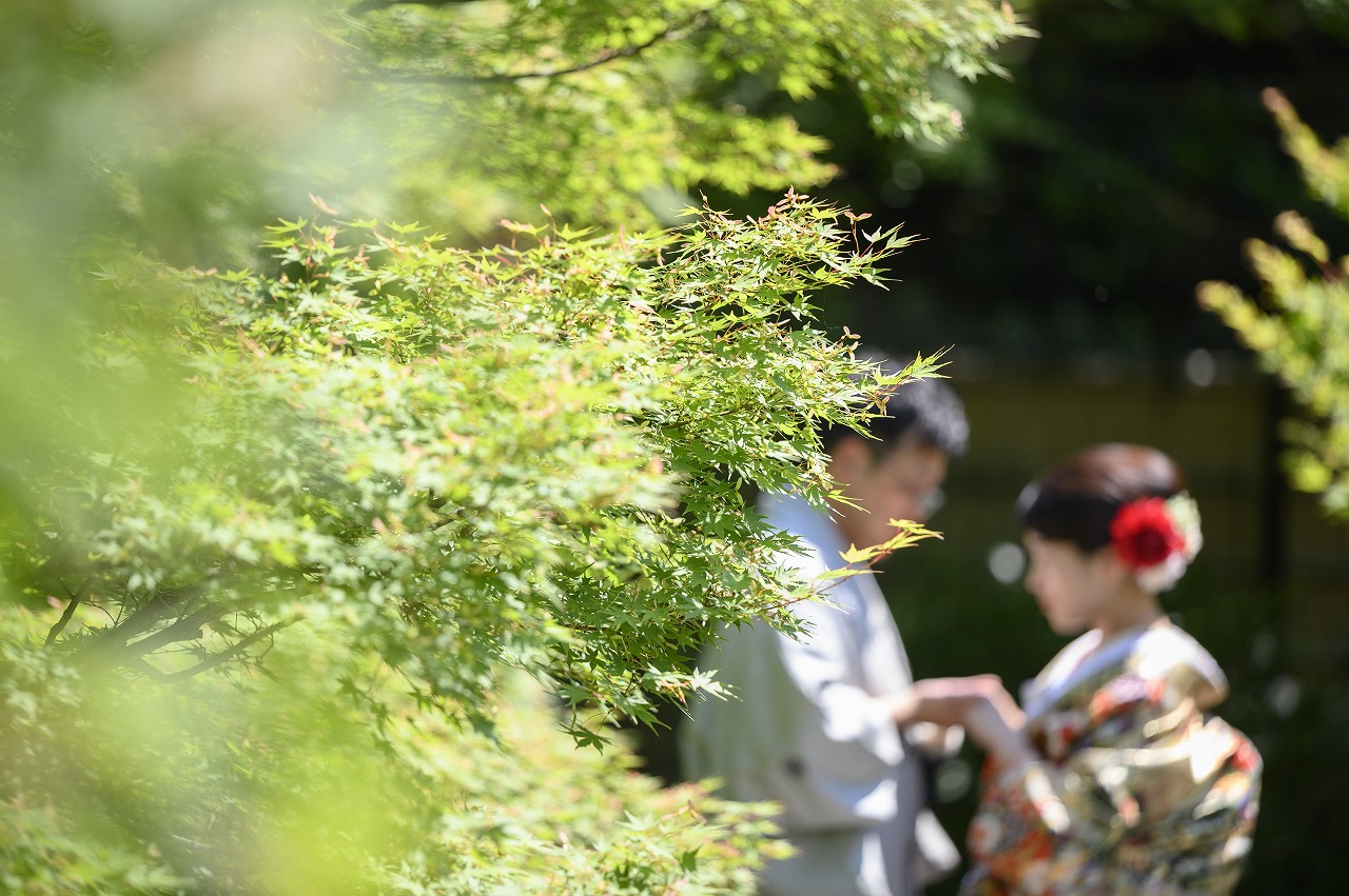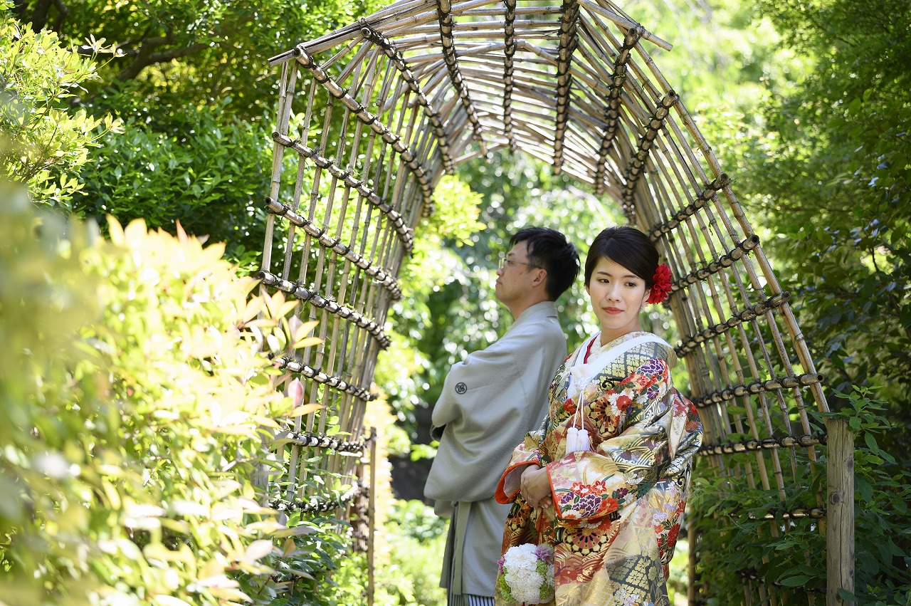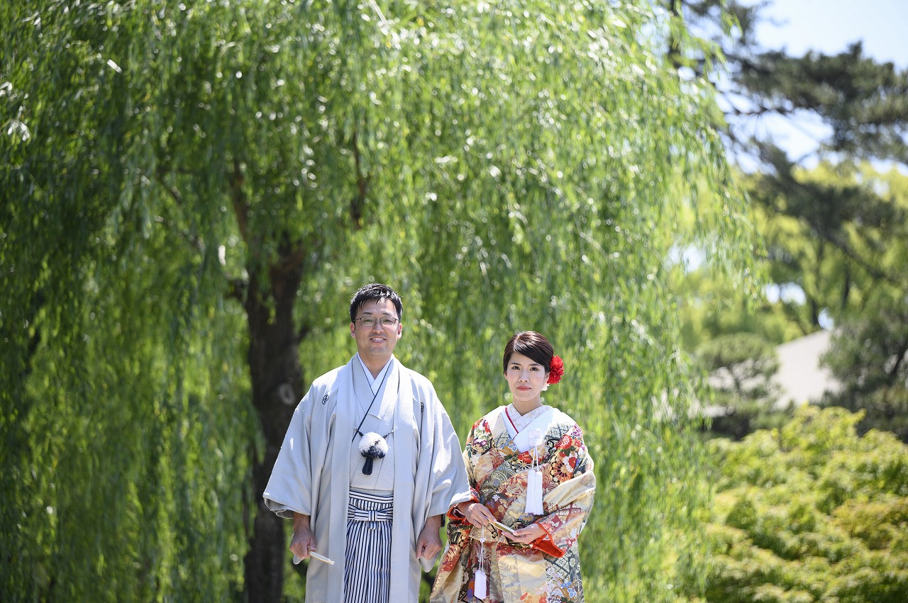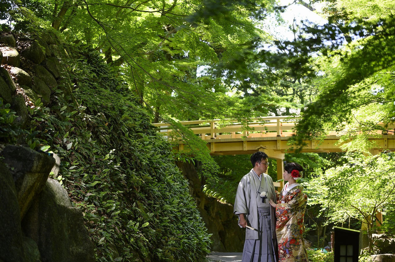 心地よい風が吹く中での撮影になりました。徳川園の美しい緑の中でご新婦様のゴールドの色打掛が