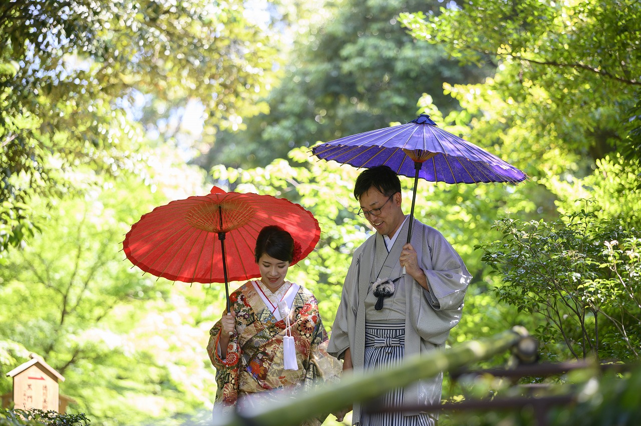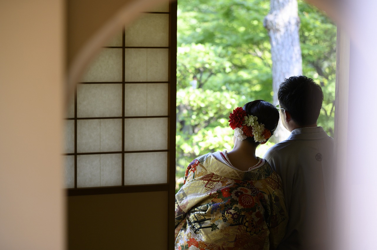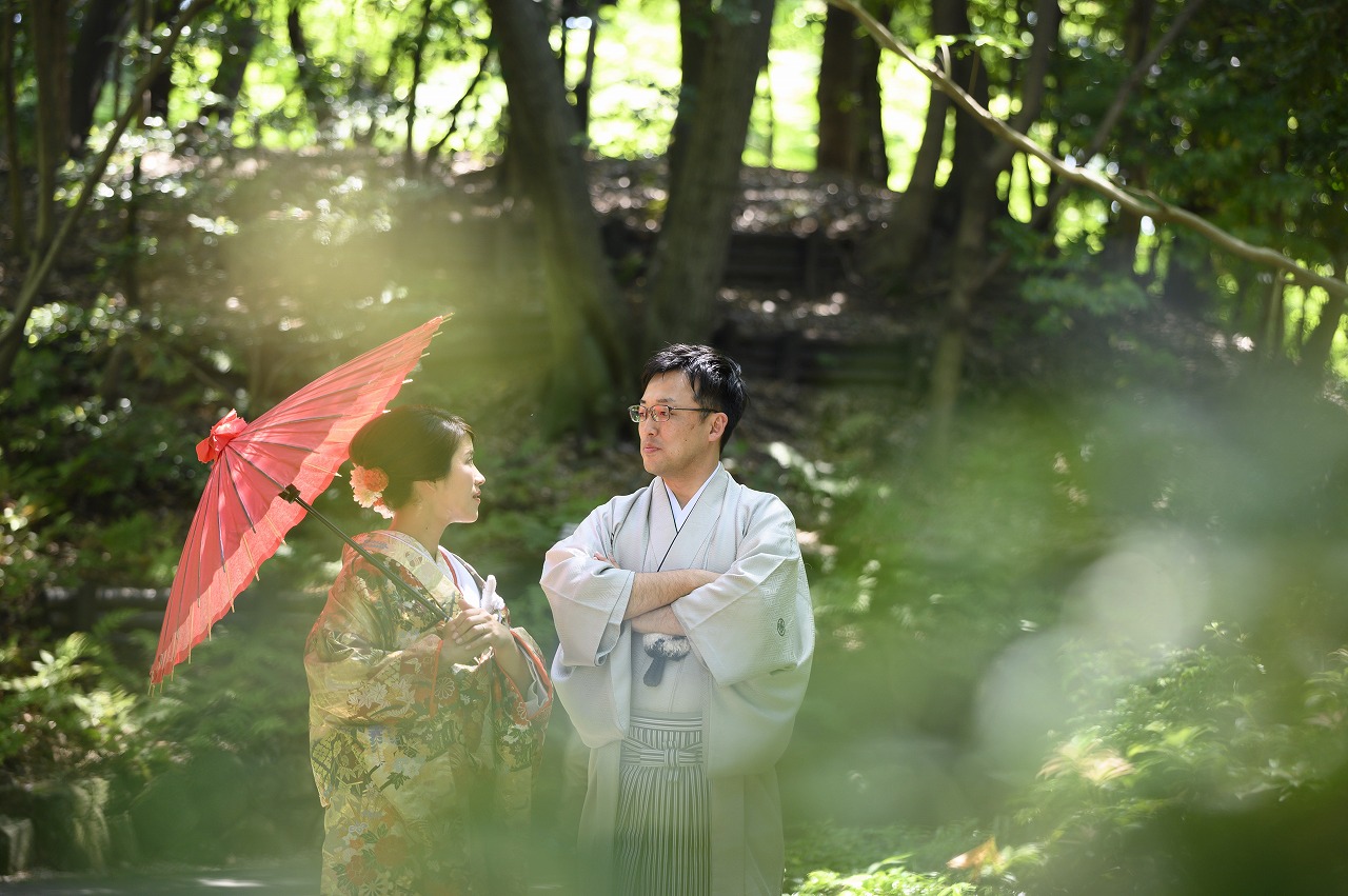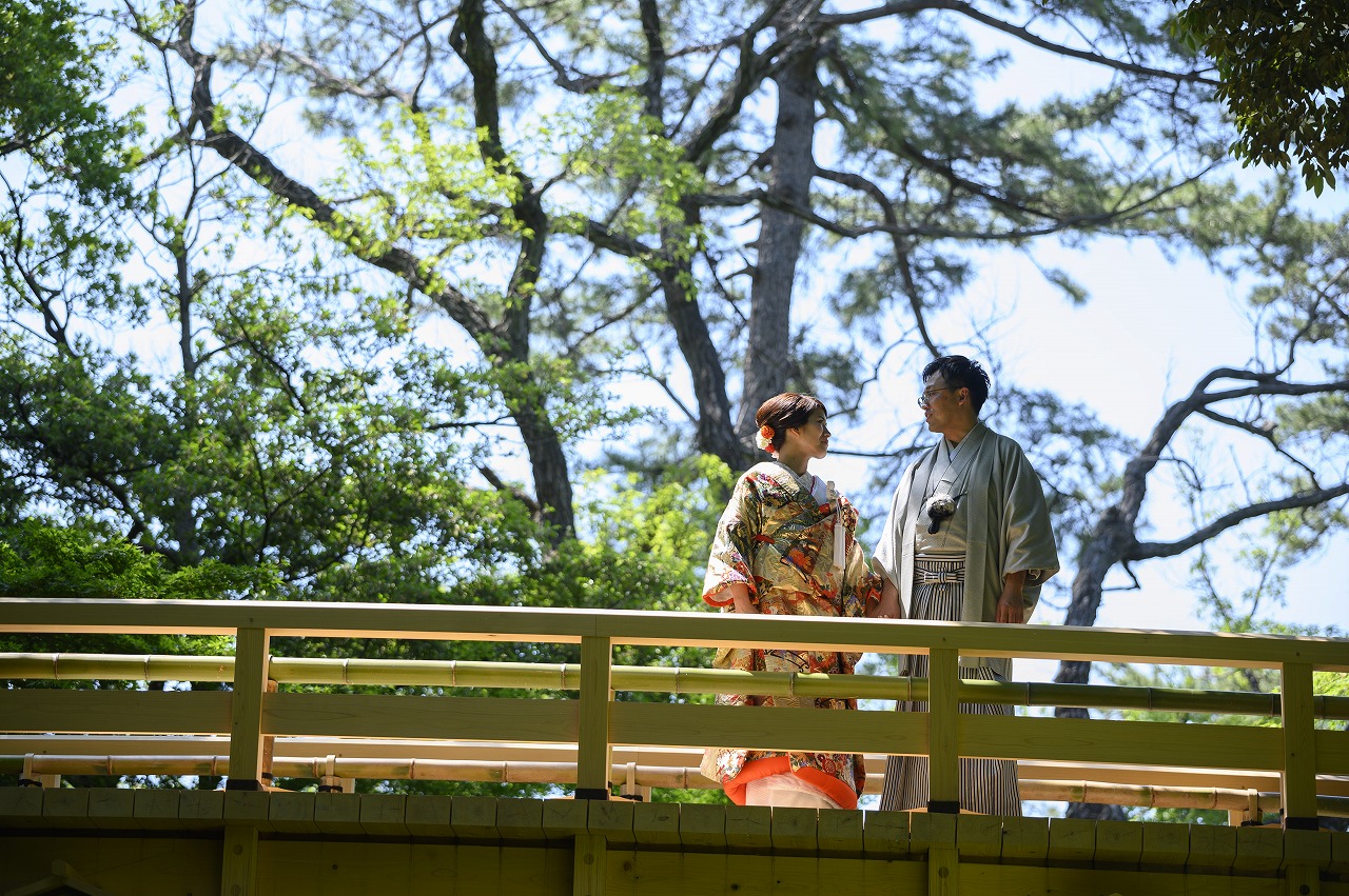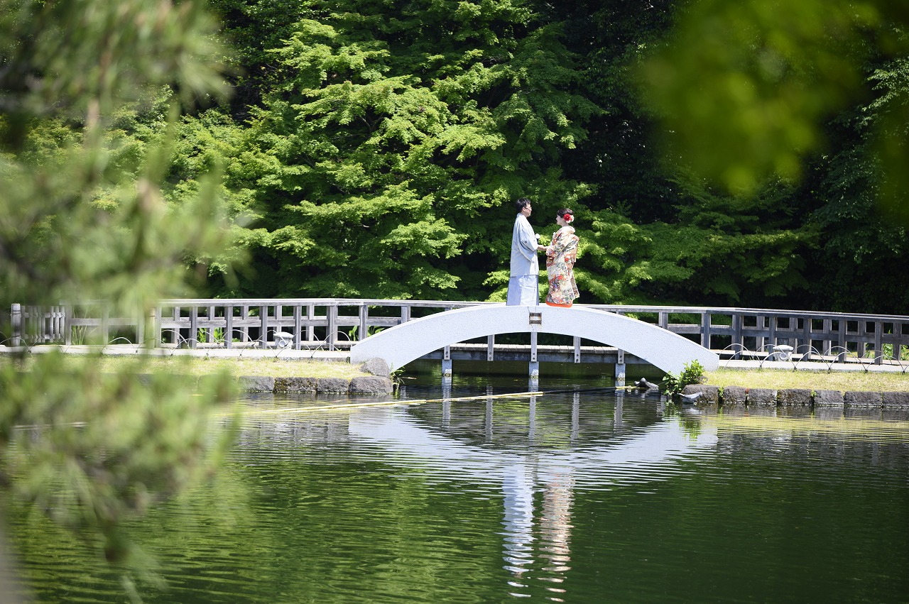 心地よい風が吹く中での撮影になりました。徳川園の美しい緑の中でご新婦様のゴールドの色打掛が