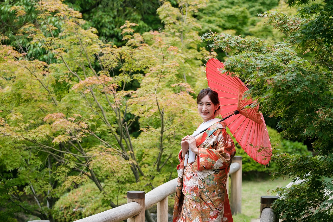 白鳥庭園の新緑にやさしい赤の色打掛が