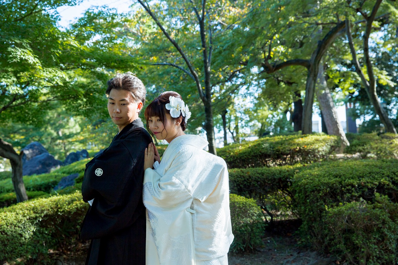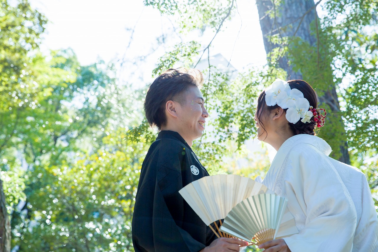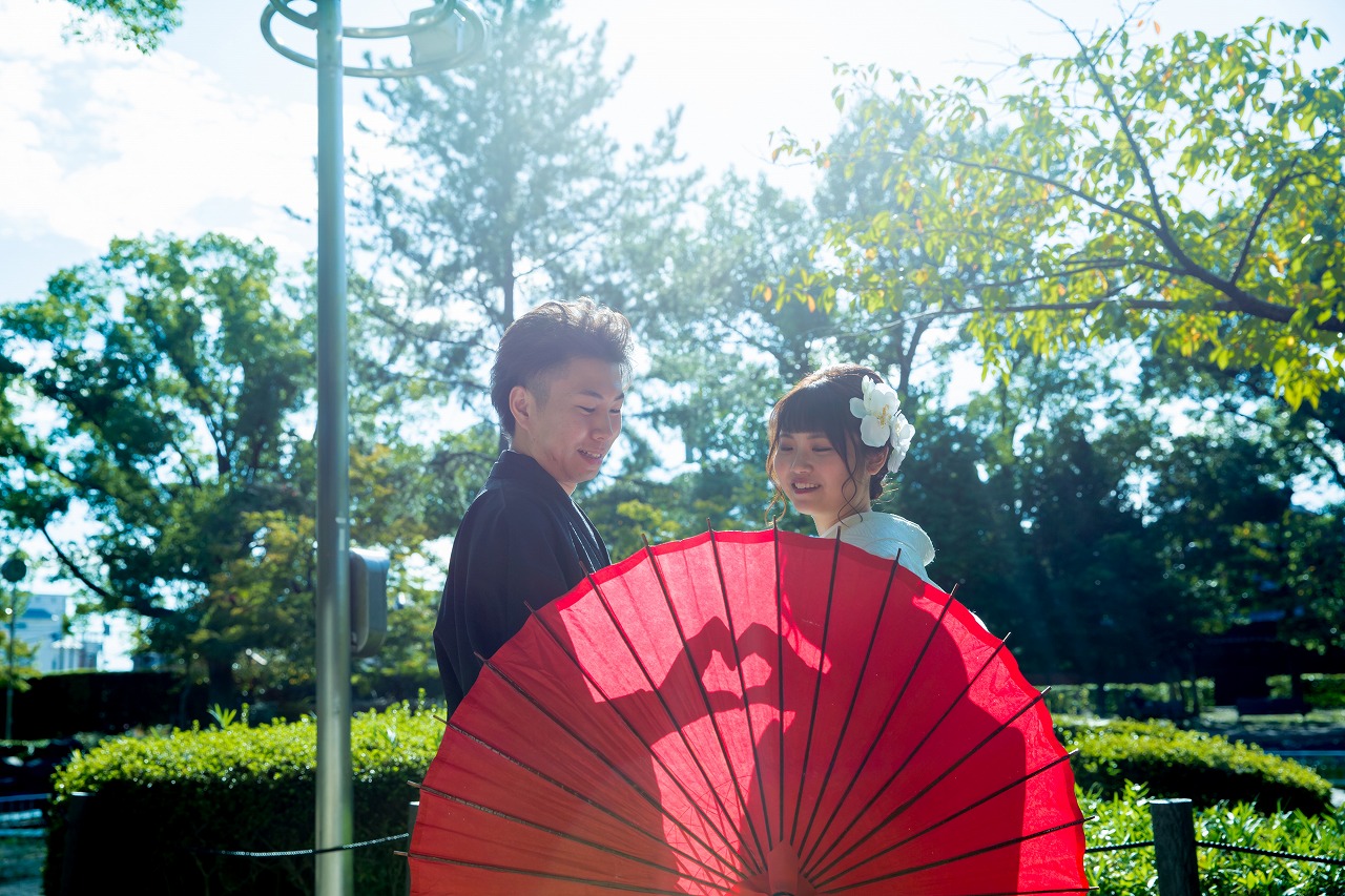 太陽に見守られながら自然いっぱいの公園で和装前撮り