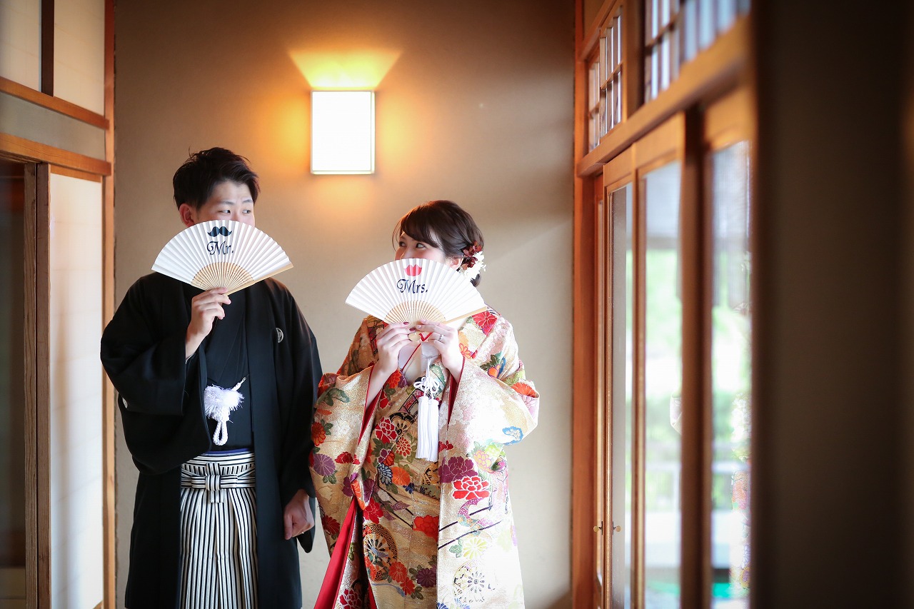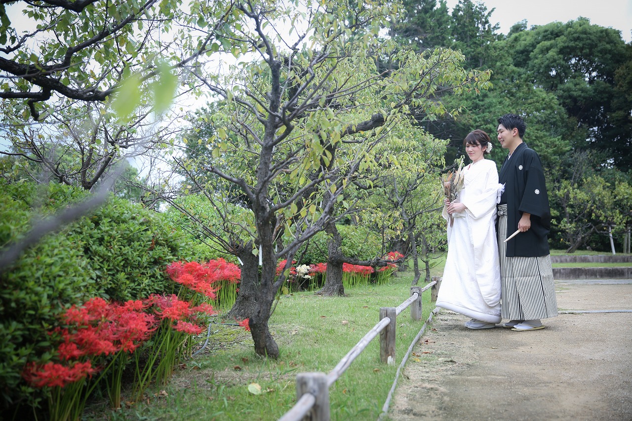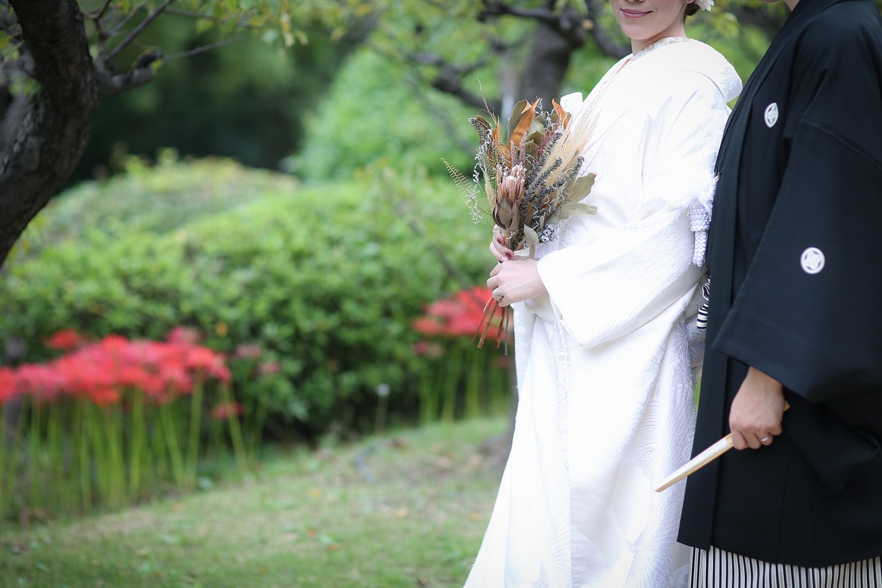 華やかな和装の前撮りをお楽しみいただきました♡庭園内には彼岸花も咲いており、