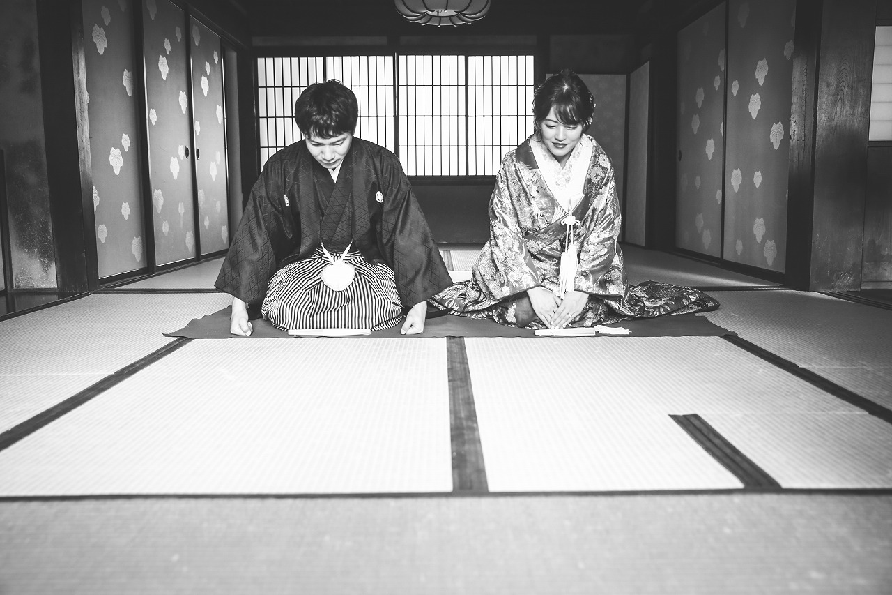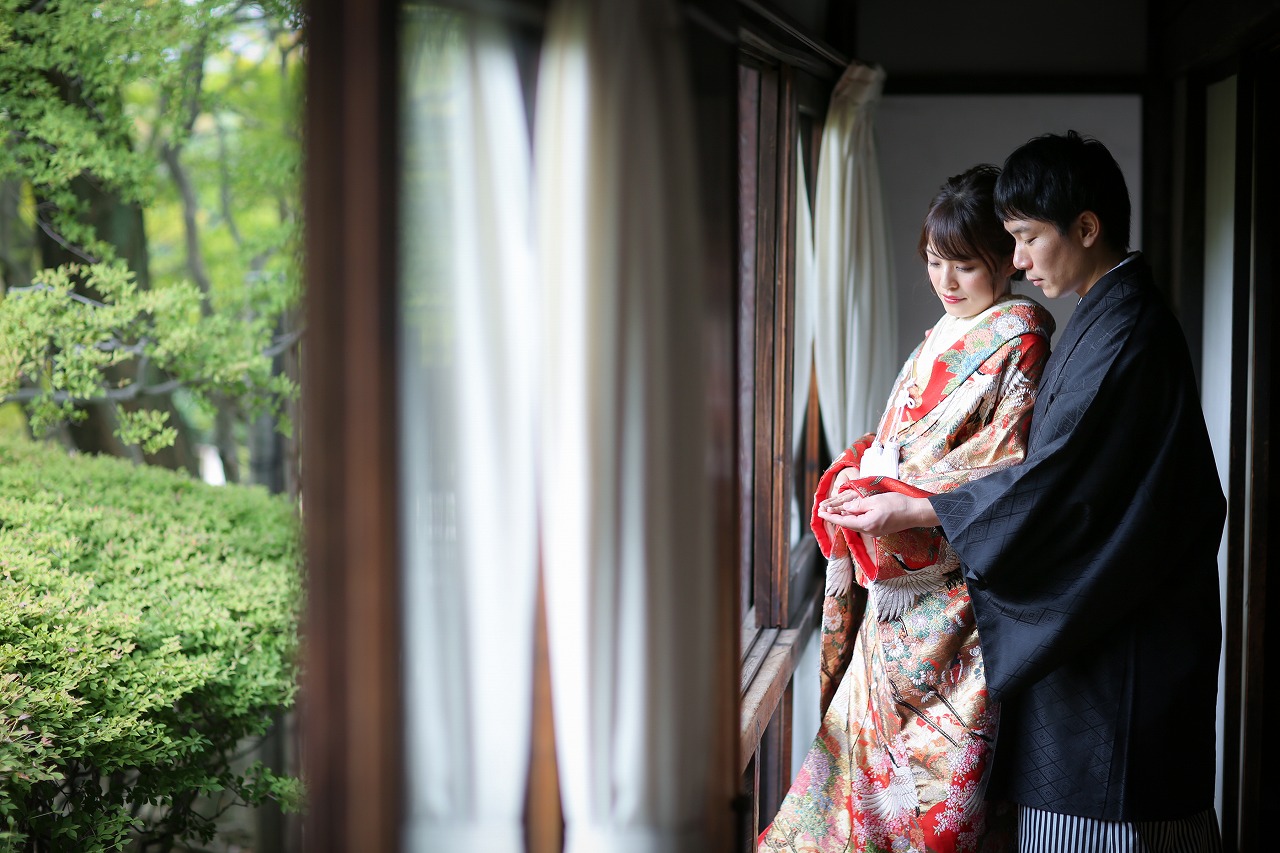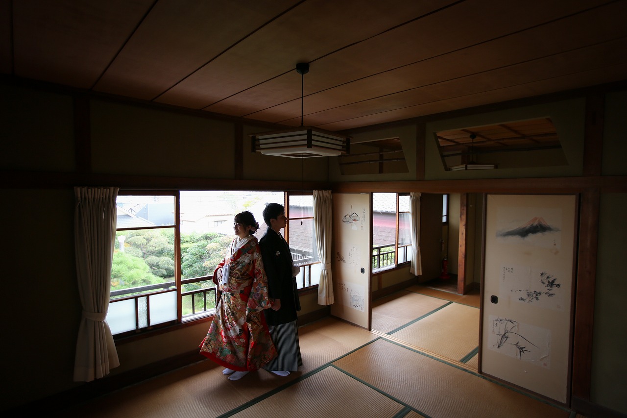 陽の光が差し込むお茶室でゆったり前撮り撮影。