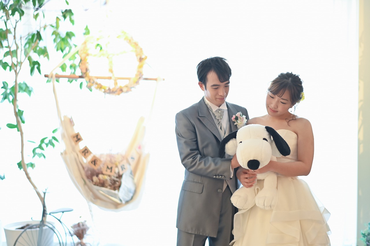 お二人が大好きなスヌーピーを抱っこしているお写真は