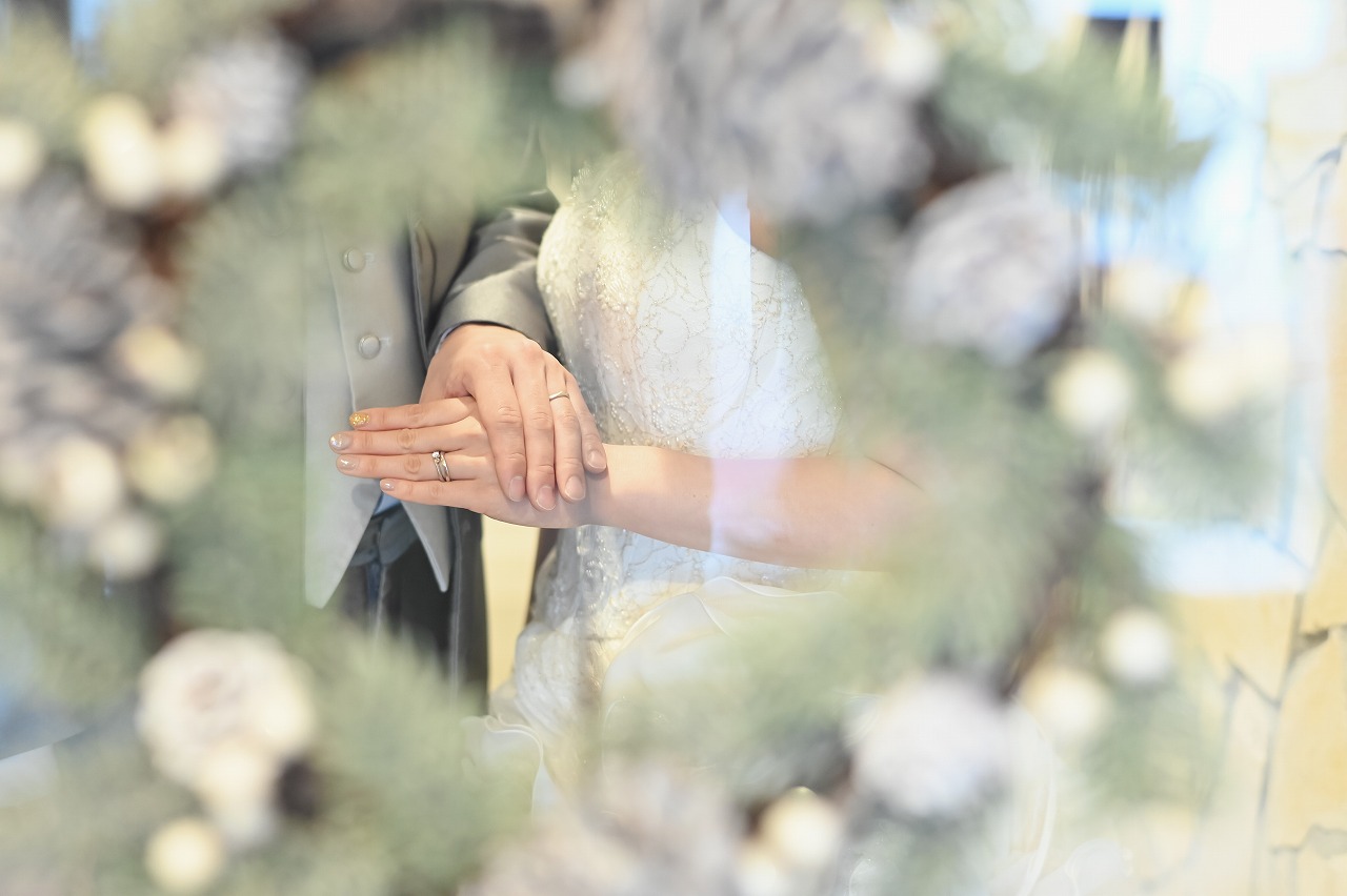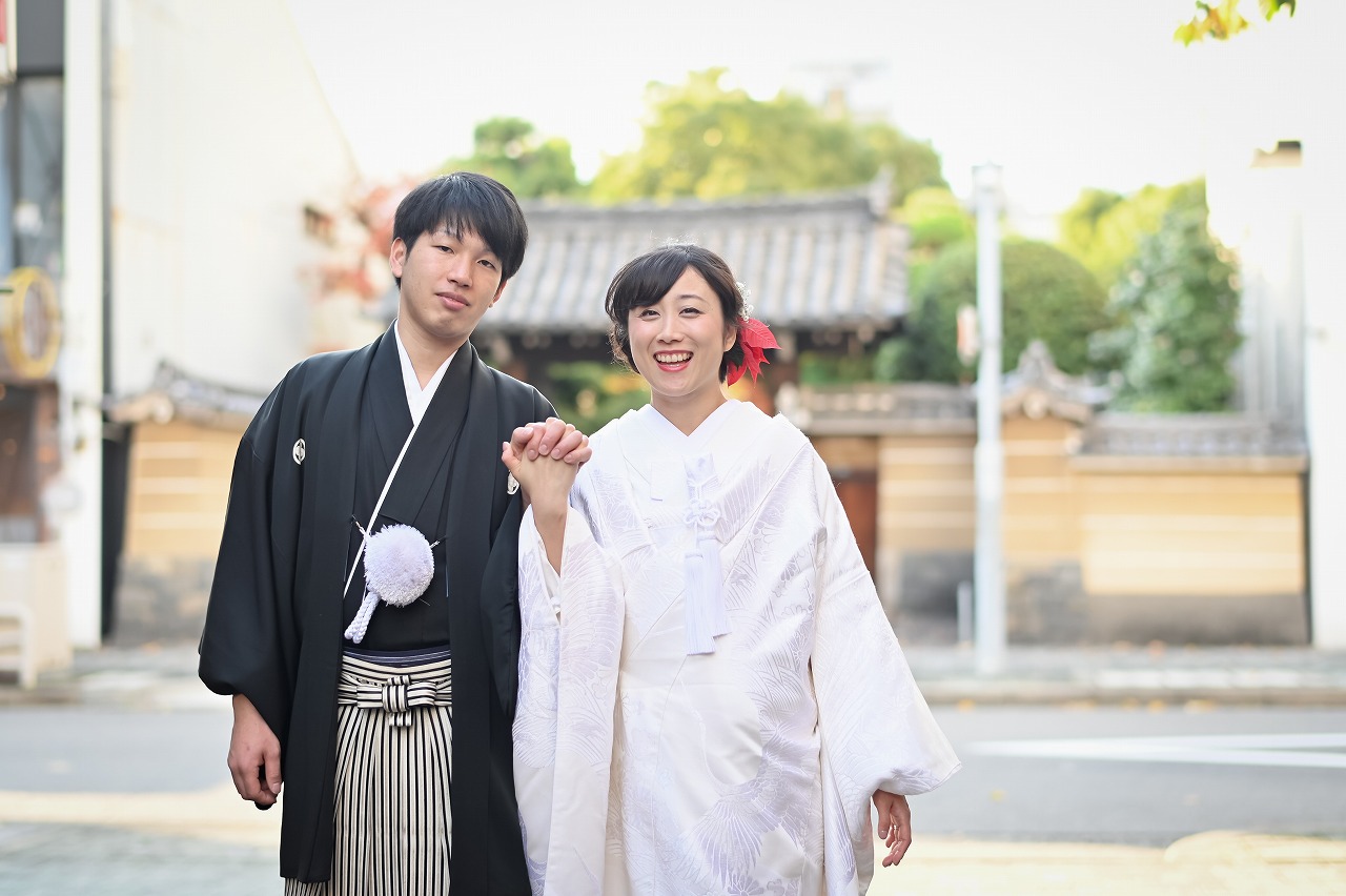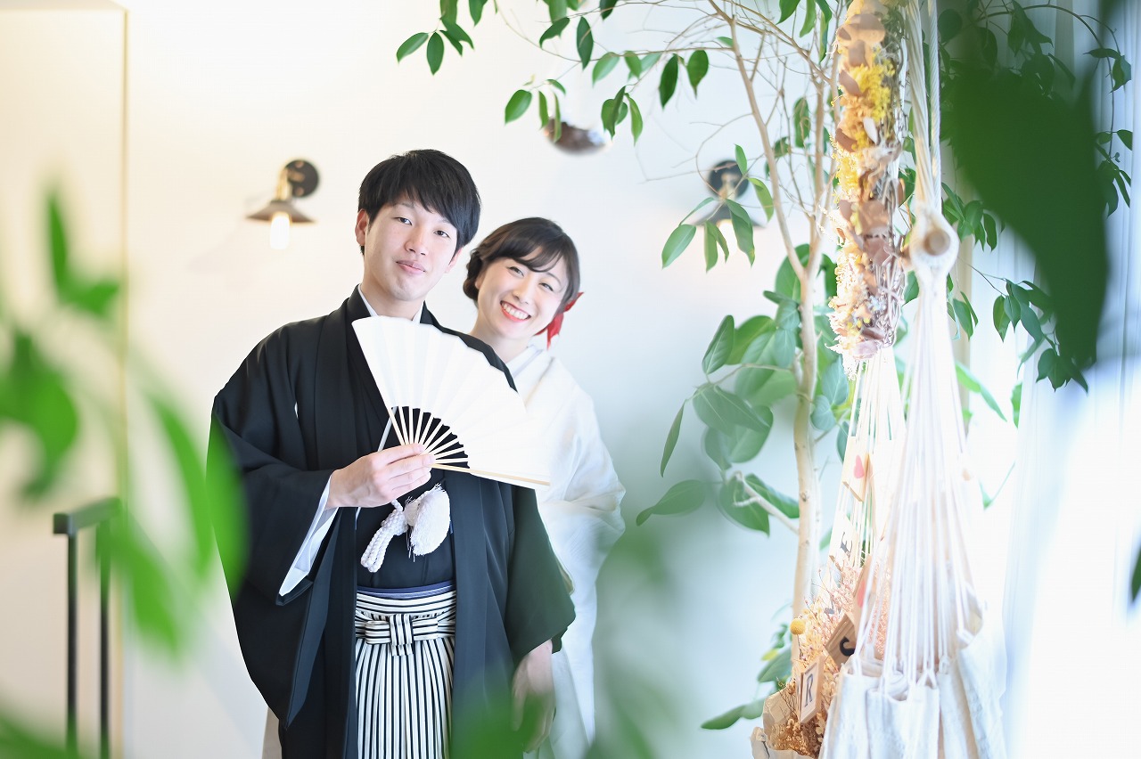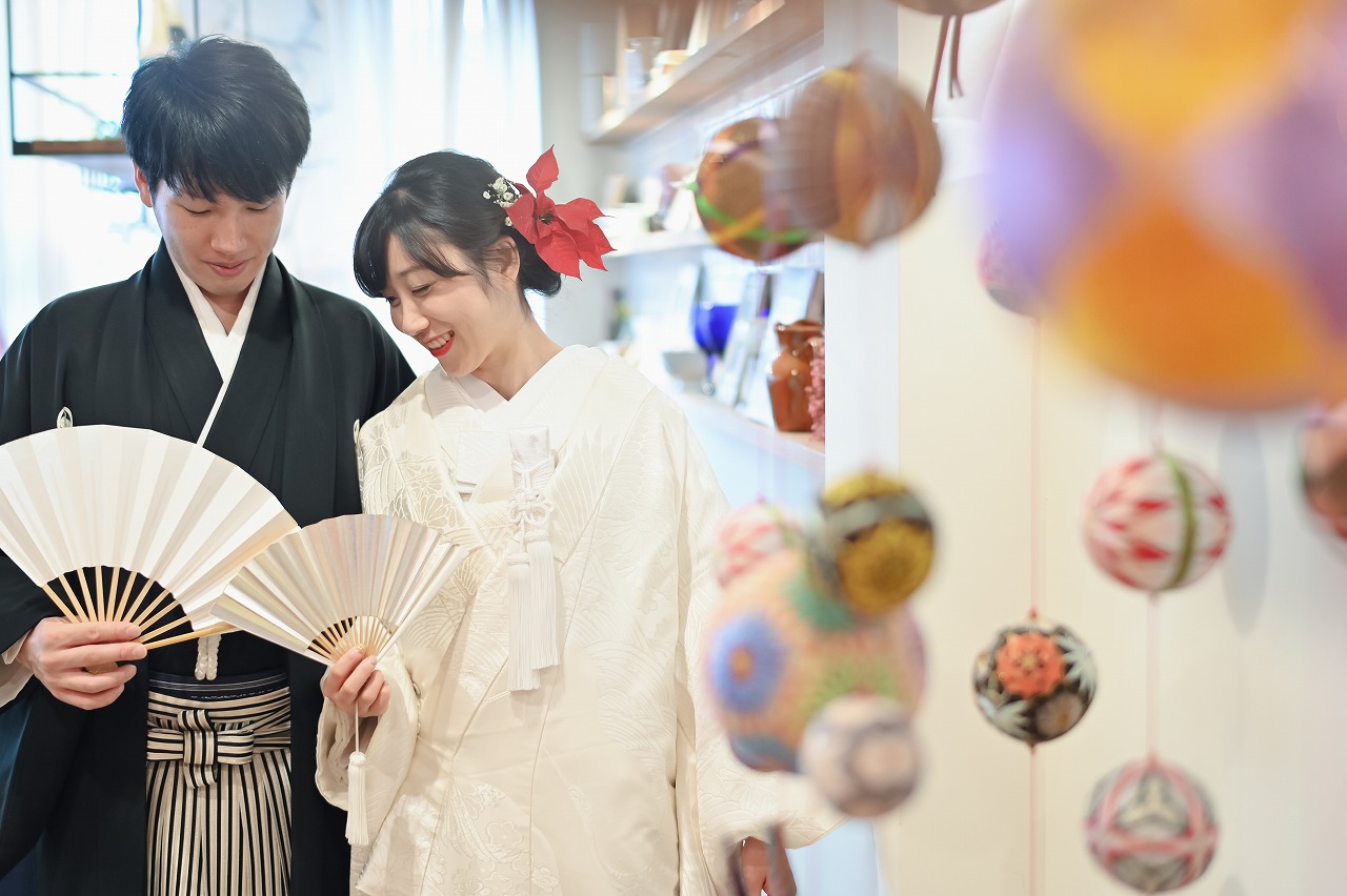 落ち着いた白無垢と、紅いポインセチアの髪飾りが素敵ですね!たくさんの笑顔に囲まれた楽しい1日でした☺