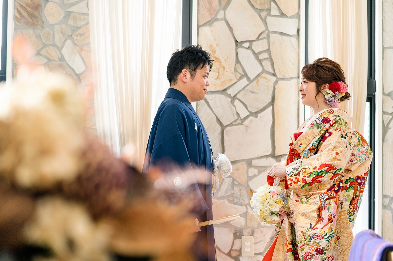 爽やかなネイビーの紋付と可愛らしい華やかな打掛が