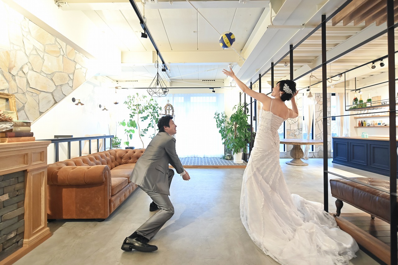ご新郎新婦様の趣味のバレーボールを使った撮影で