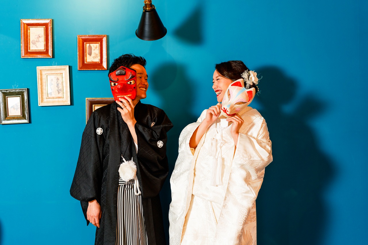 使った撮影で、より自然な笑顔で撮影ができましたね!カラフルな背景のスタジオに真っ白な白無垢が