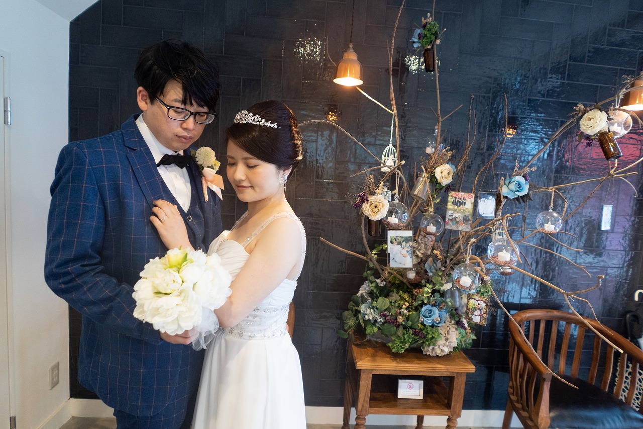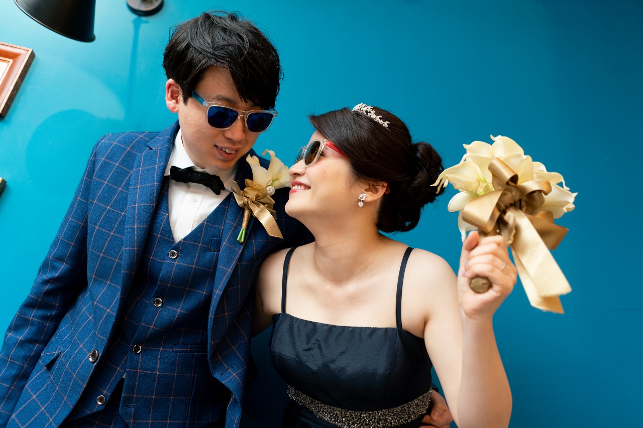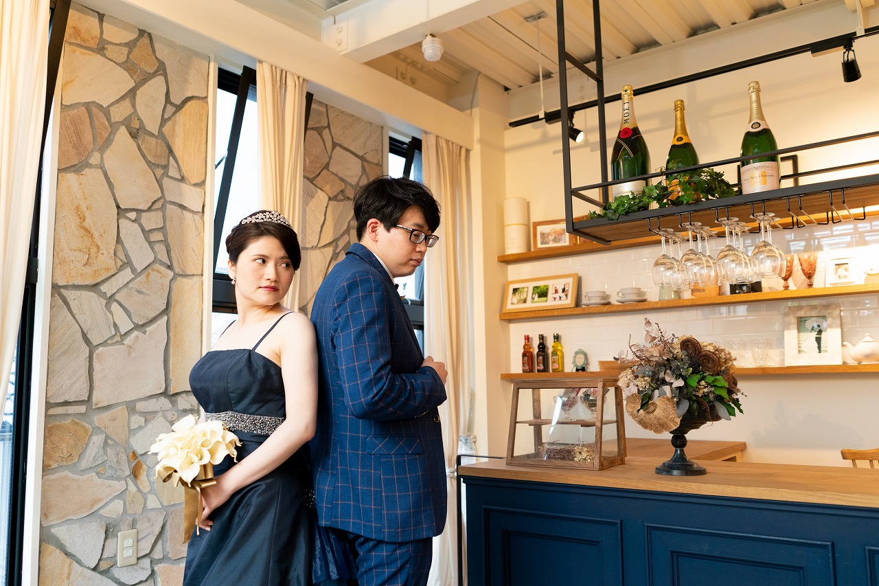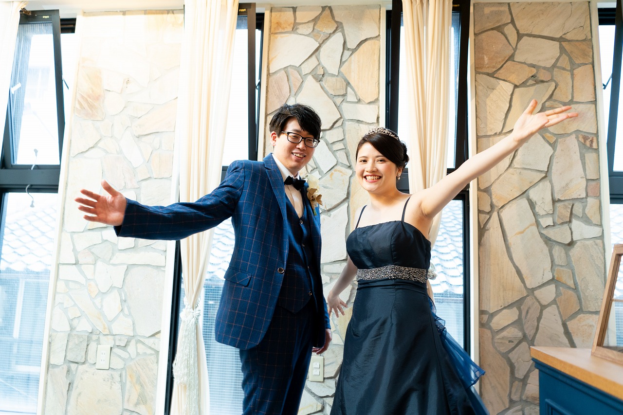 ネイビーのドレスが大人っぽくて最高にお似合いです!これからも末永くお幸せに♡