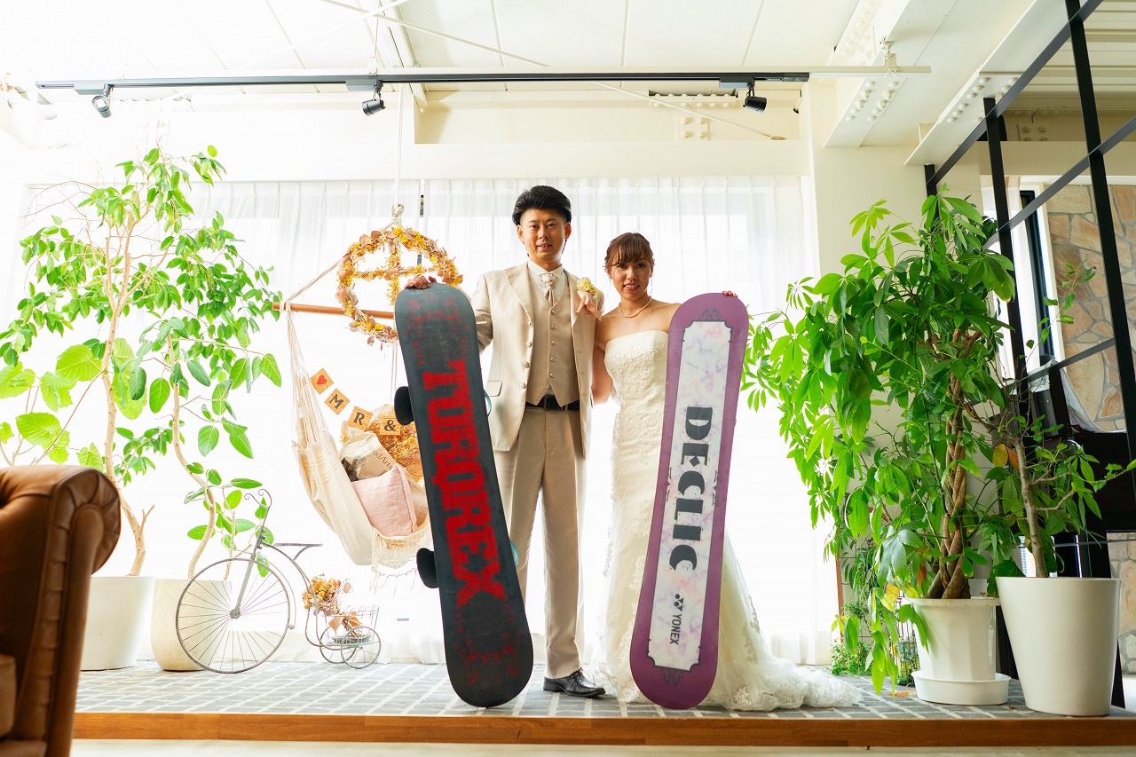 二人の趣味であるスノーボードと一緒に撮影していただけて嬉しかったです。ポーズもいろいろ考えていただき、感謝しています。