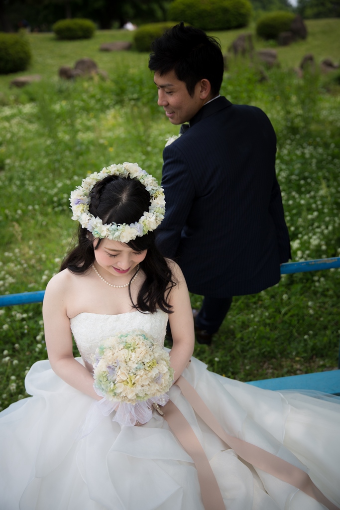 撮影当日だけでなく、準備からお二人で楽しめる、そんなご新郎ご新婦様が本当に素敵でした(^^)庄内緑地公園とお二人のやりたい撮影の雰囲気もピッタリ♪