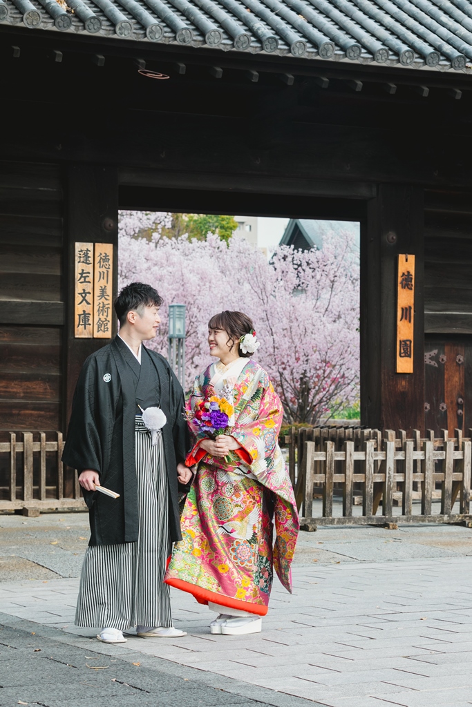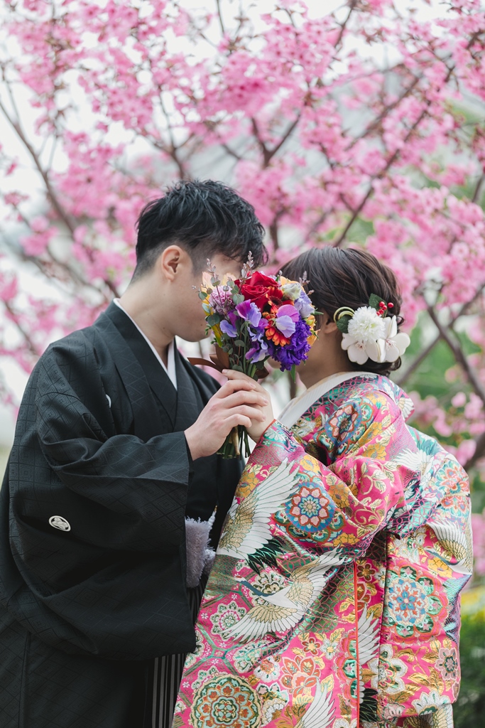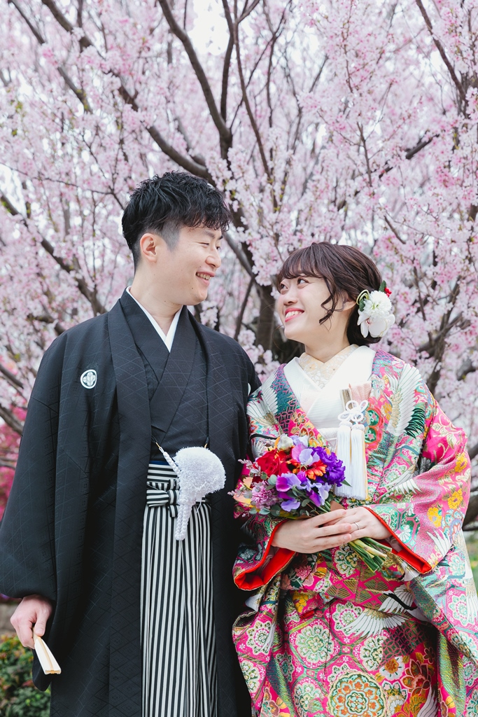 対応していただいた着付けのスタッフの方やメイクのスタッフの方、カメラマンのスタッフの方みなさんとても親切に対応してくださりリラックスして和装の撮影に臨むことができました。徳川園での撮影ではちょうど桜が満開で天気も気持ちよく最高のコンディションでした。他のお客さんや近所の方におめでとうと言っていただけたのが嬉しかったです。