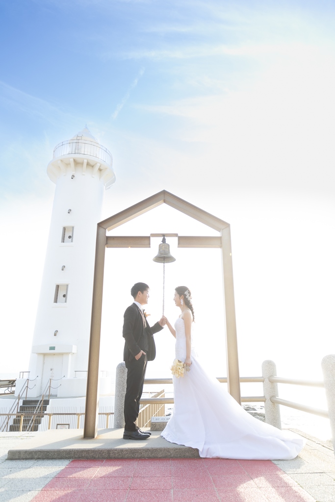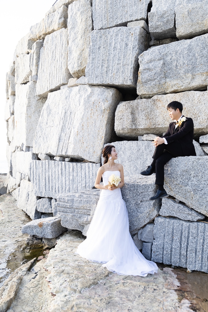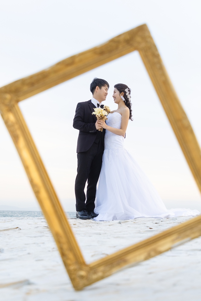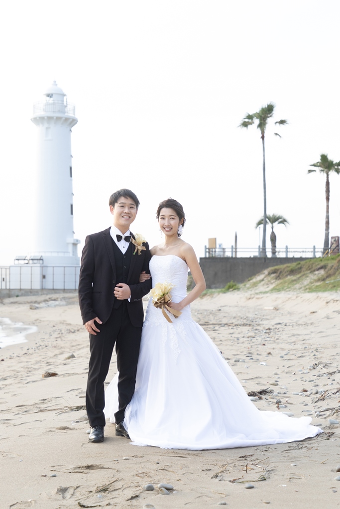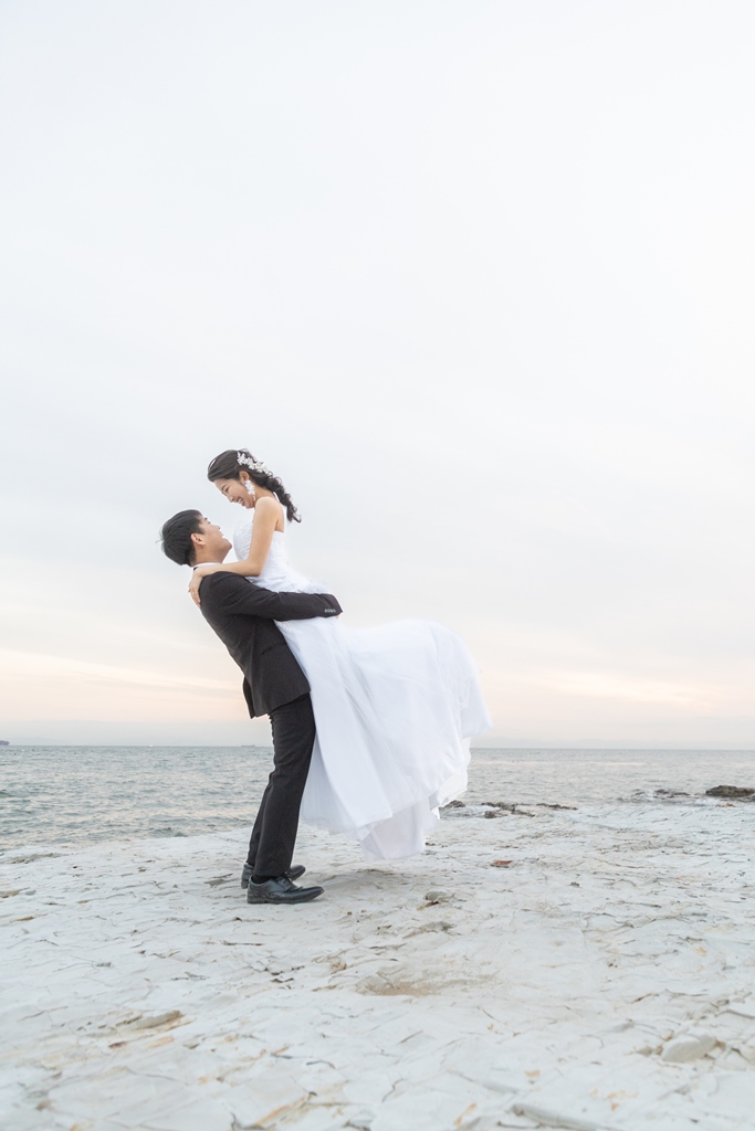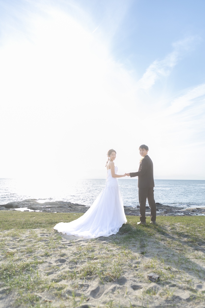 内海のビーチで憧れのフォトウェディング|名古屋前撮りロケーション洋装