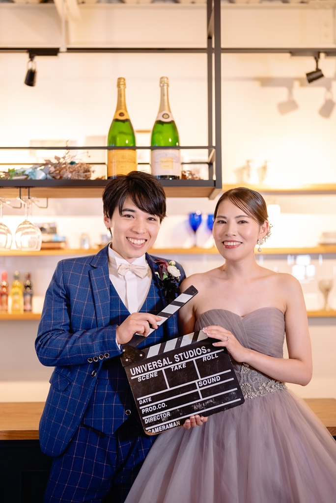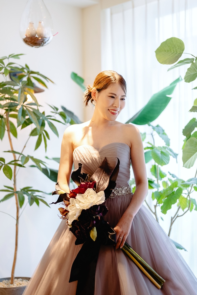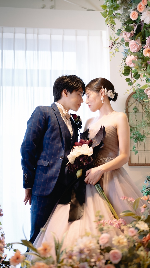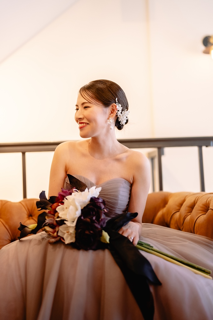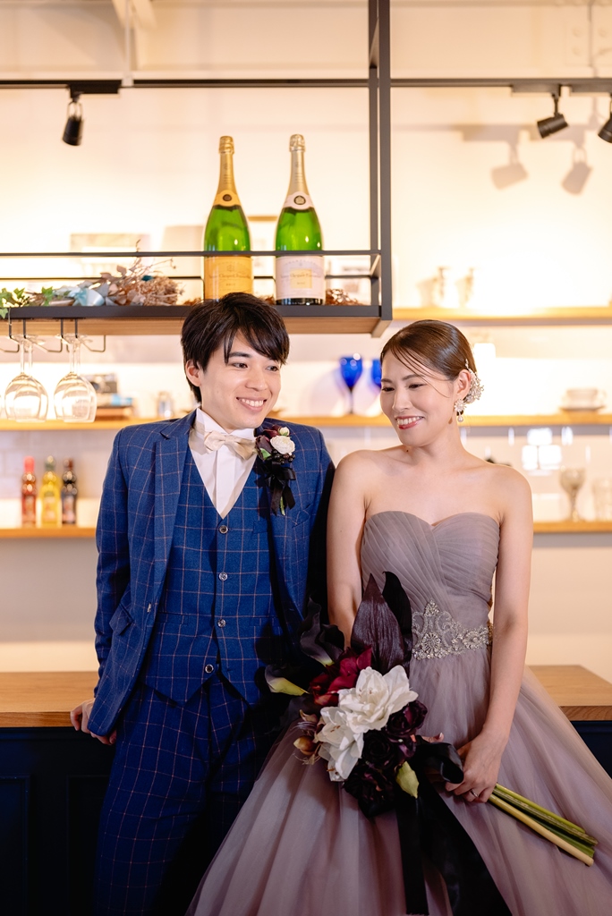 スタジオでの洋装撮影お疲れ様でした。新作のカラードレスがとてもお似合いでスタジオとの雰囲気も良く合いどのお写真も可愛かったです!小物合わせもどれも素敵でブーケやアクセサリー、ヘアセットすべてがお2人らしく新婦様のセンスが光ってました!