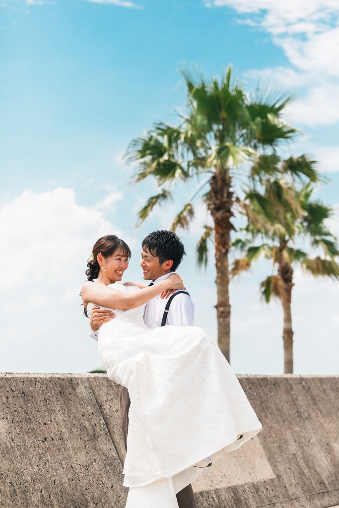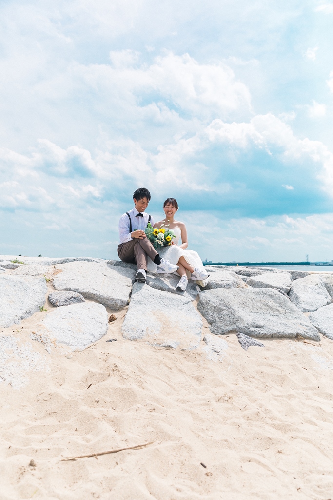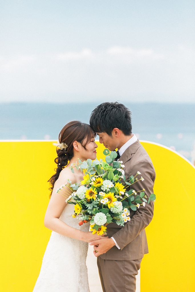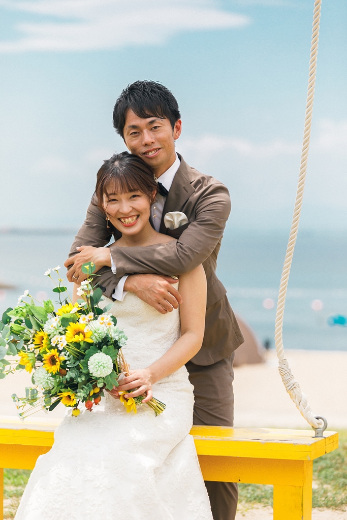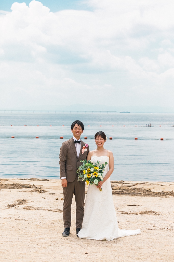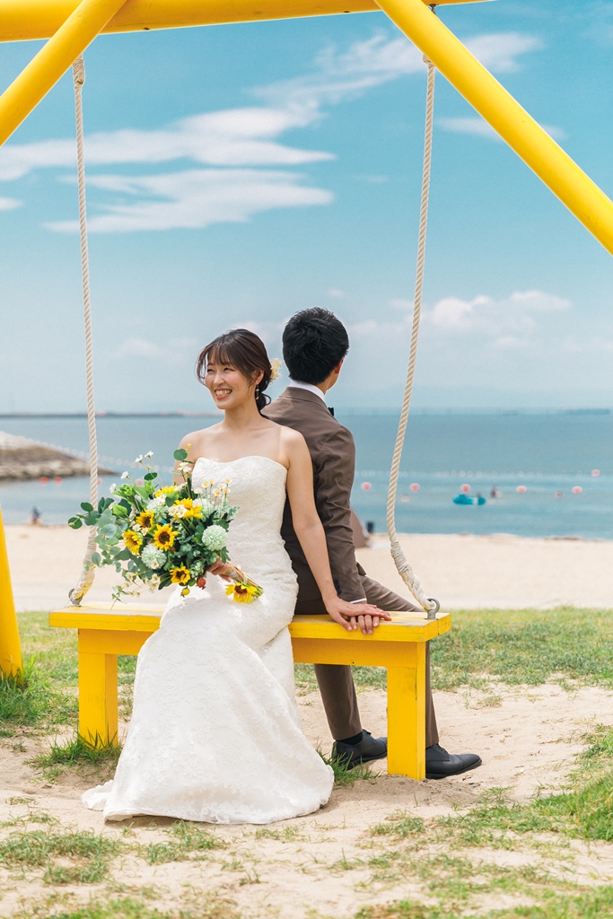 洋装のりんくうビーチでは新作の向日葵のブーケをお持ちいただきとても可愛く撮影いただきました。終始楽しそうなお2人が写真からも伝わってきました!