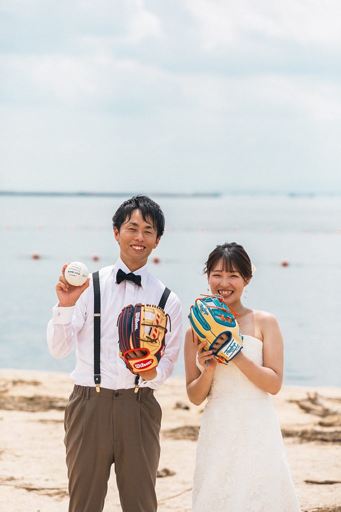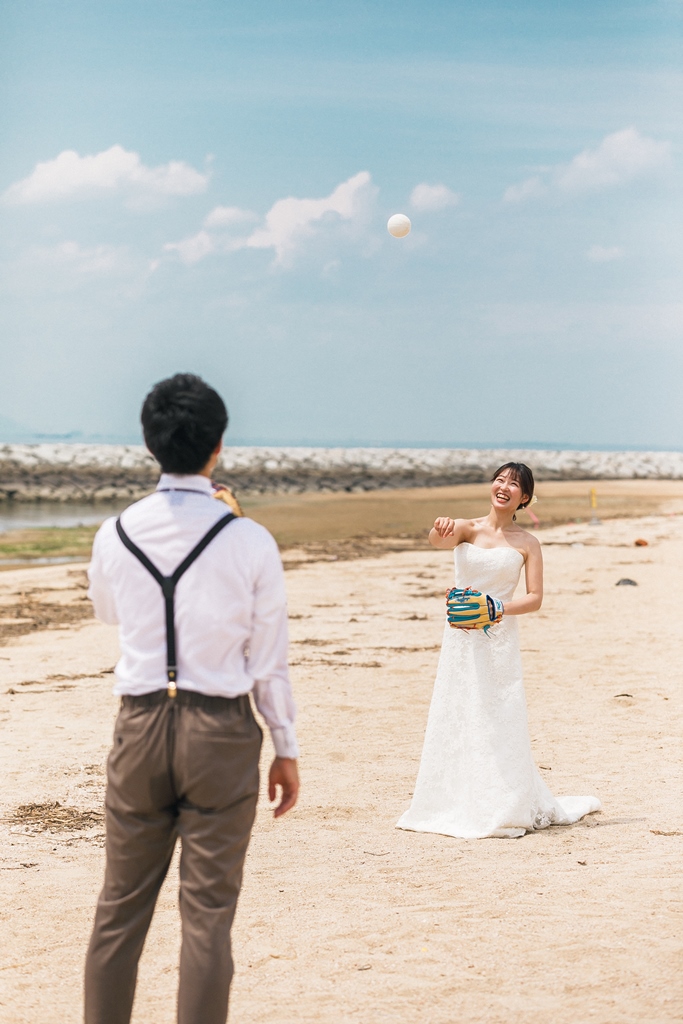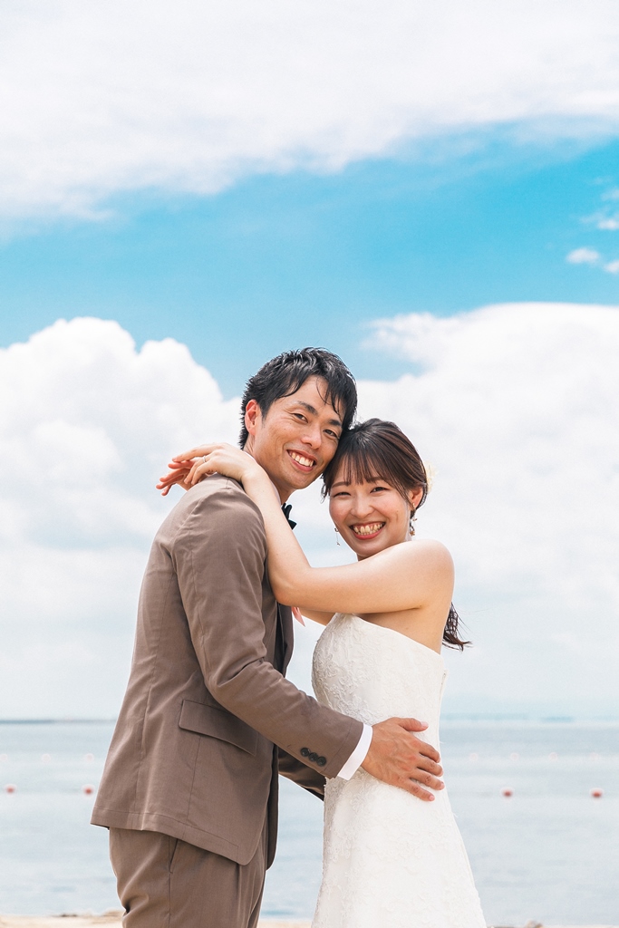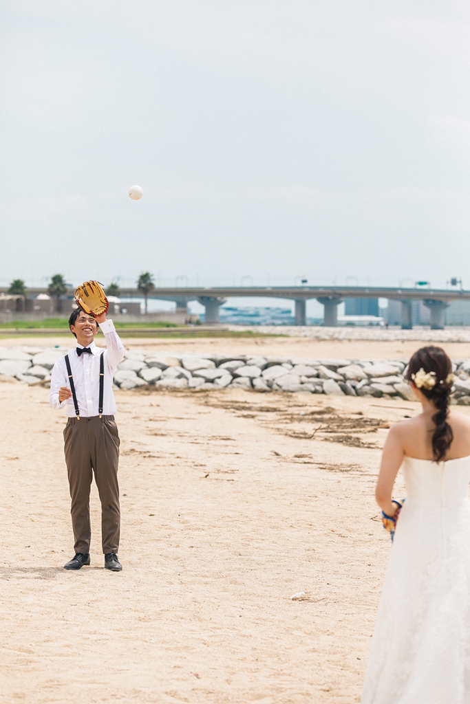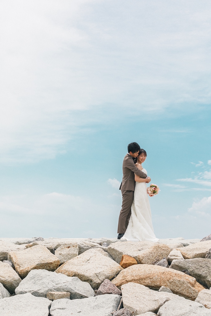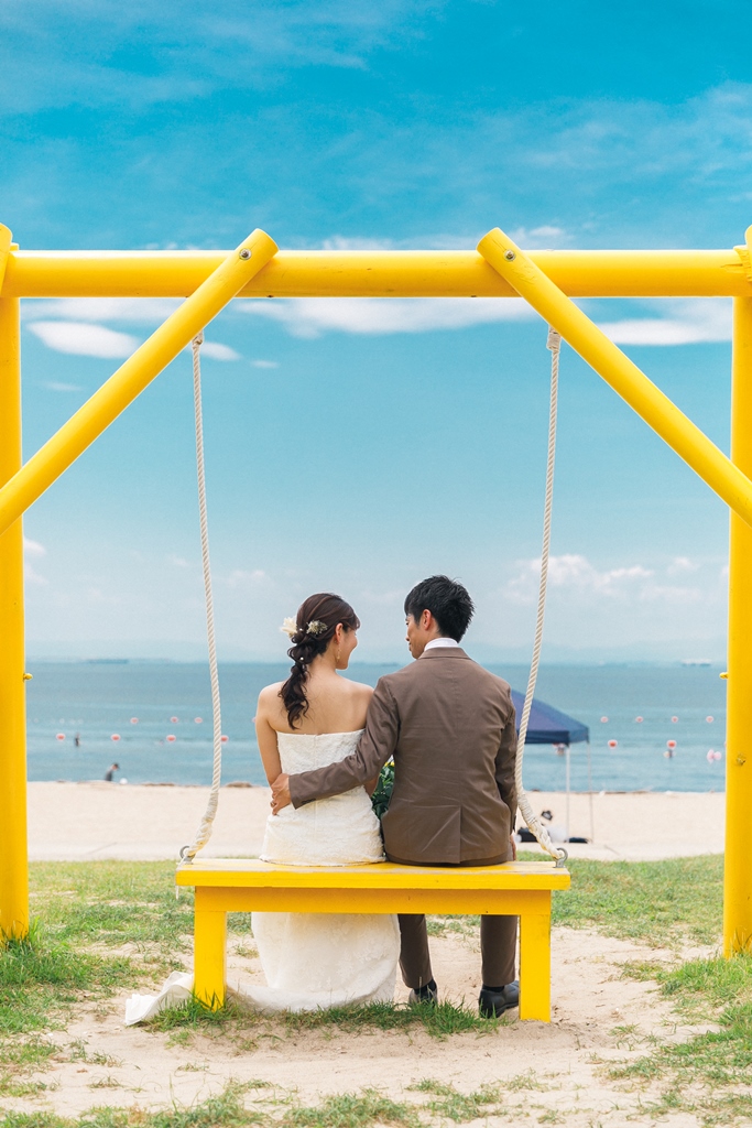 洋装のりんくうビーチでは新作の向日葵のブーケをお持ちいただきとても可愛く撮影いただきました。終始楽しそうなお2人が写真からも伝わってきました!