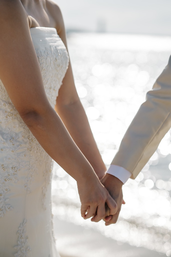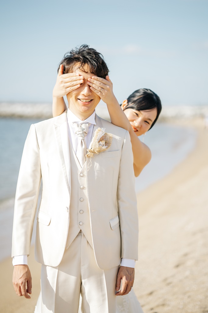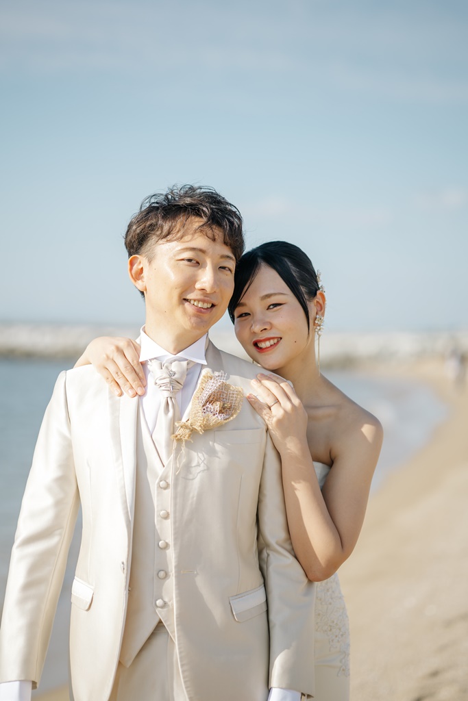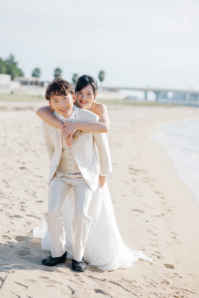 スタッフやカメラマンの方が気さくで、自分たちが普段撮られ慣れていないにも関わらず、自然な笑顔を引き出して頂いて大変満足しています。また、天気も良く風も弱くりんくうビーチでの撮影がとてもしやすかったです。