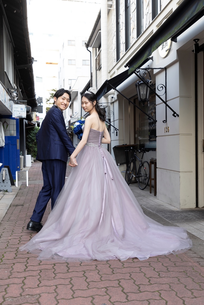 お二人のコーデがスタジオに合っていて、素敵なお写真がたくさん♡パープルのカラードレスがよくお似合いで素敵でした☆彡