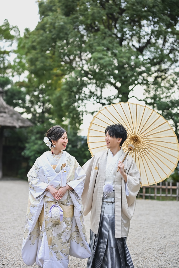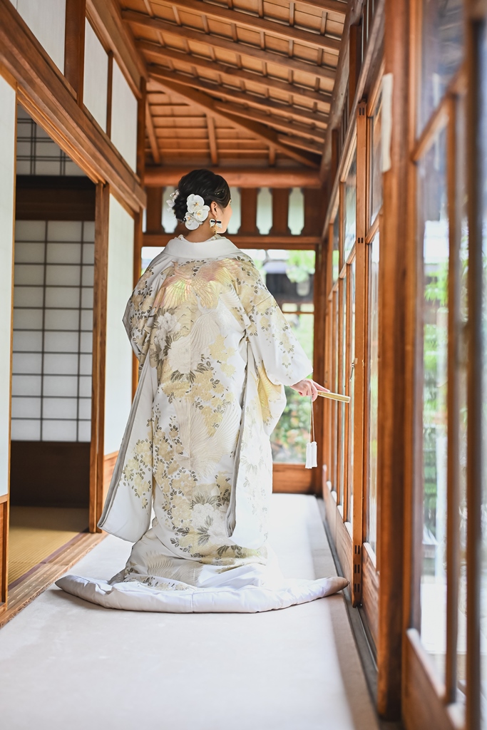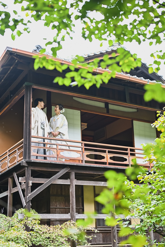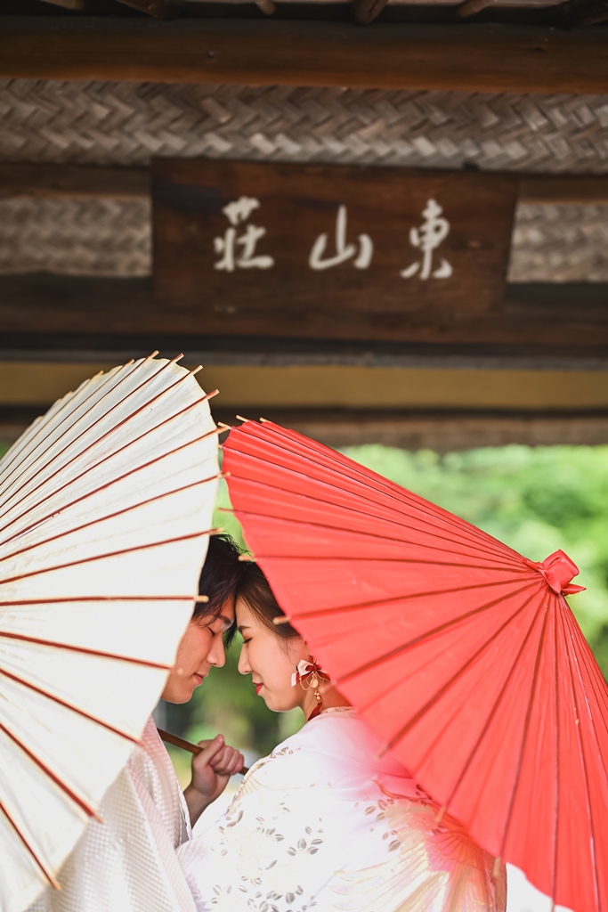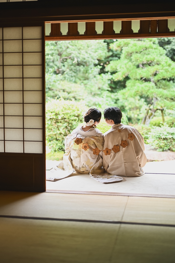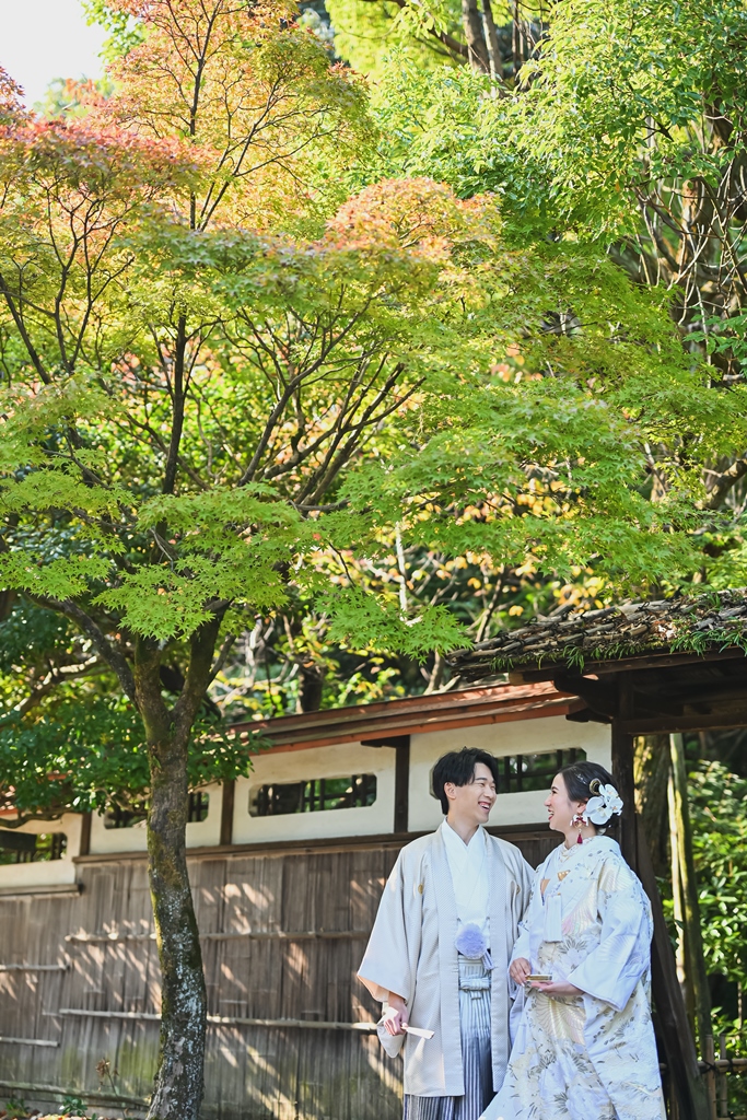 和装では東山荘にて撮影した。綺麗な日本庭園を楽しみながら、素晴らしい写真を撮るためのポーズの指示や、頻繁な衣装の整えなど、親身に寄り添ってサービスを提供していただいた。
