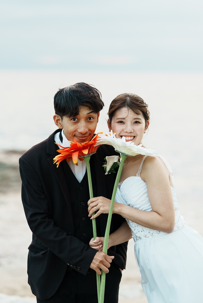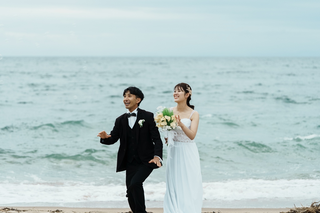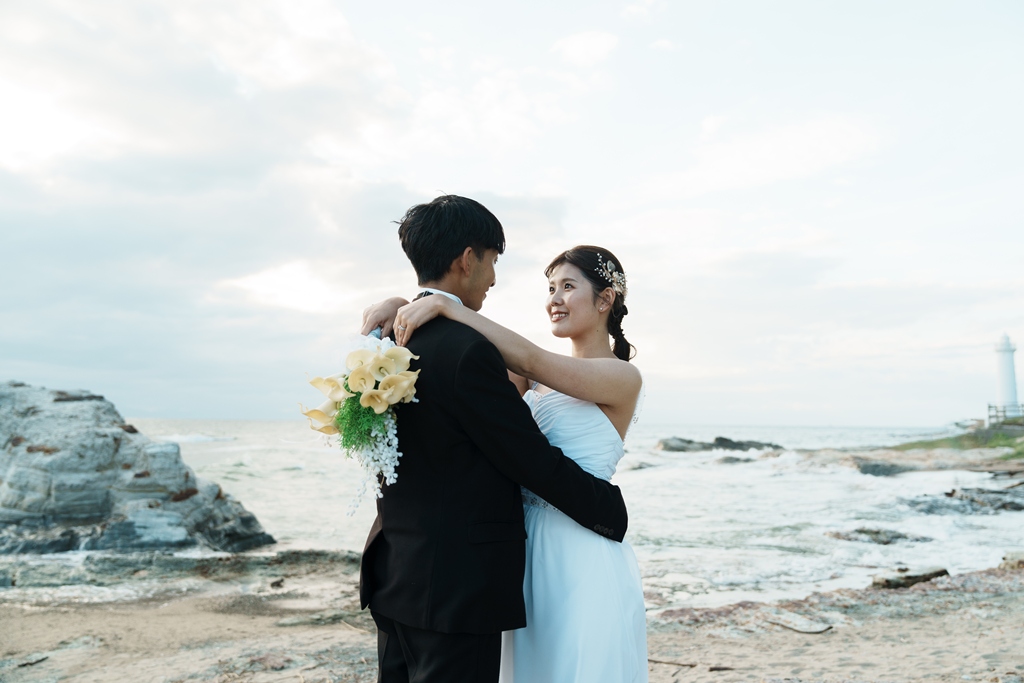 波打ち際を歩く姿、夕陽を背に抱き合う瞬間、そして柔らかな海風に吹かれるドレスの動き——そのすべてが、ここでしか残せない唯一無二の思い出となりました。撮影中の笑顔や楽しそうな雰囲気は、写真や映像を通して永遠に形として残ります。