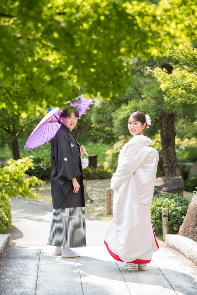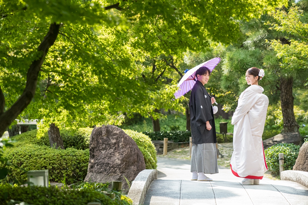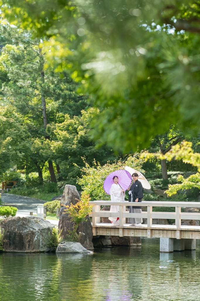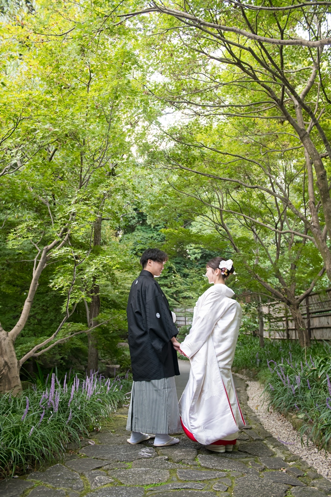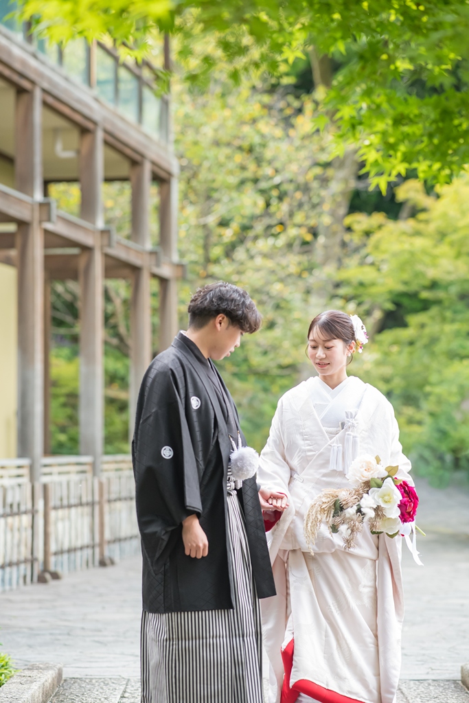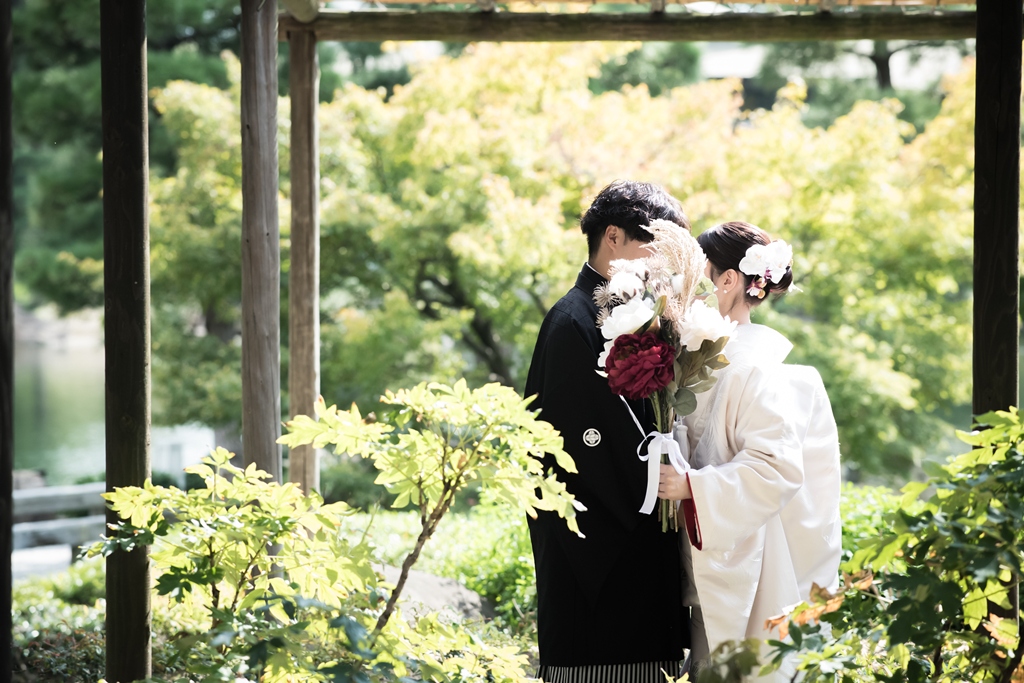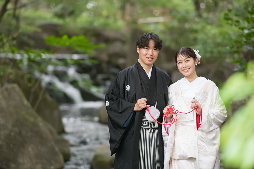 黒門の重厚さや龍門の滝の力強い流れ、澄んだ水辺に映る自然の光が、おふたりの特別な一日を上品に引き立ててくれました。撮影当日、和装ならではの気品をまとったおふたりが庭園内を歩くたびに、周囲の景色がまるで絵巻物のように表情を変え、スタッフ一同、胸が熱くなる思いでシャッターを切っておりました。