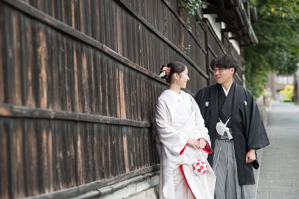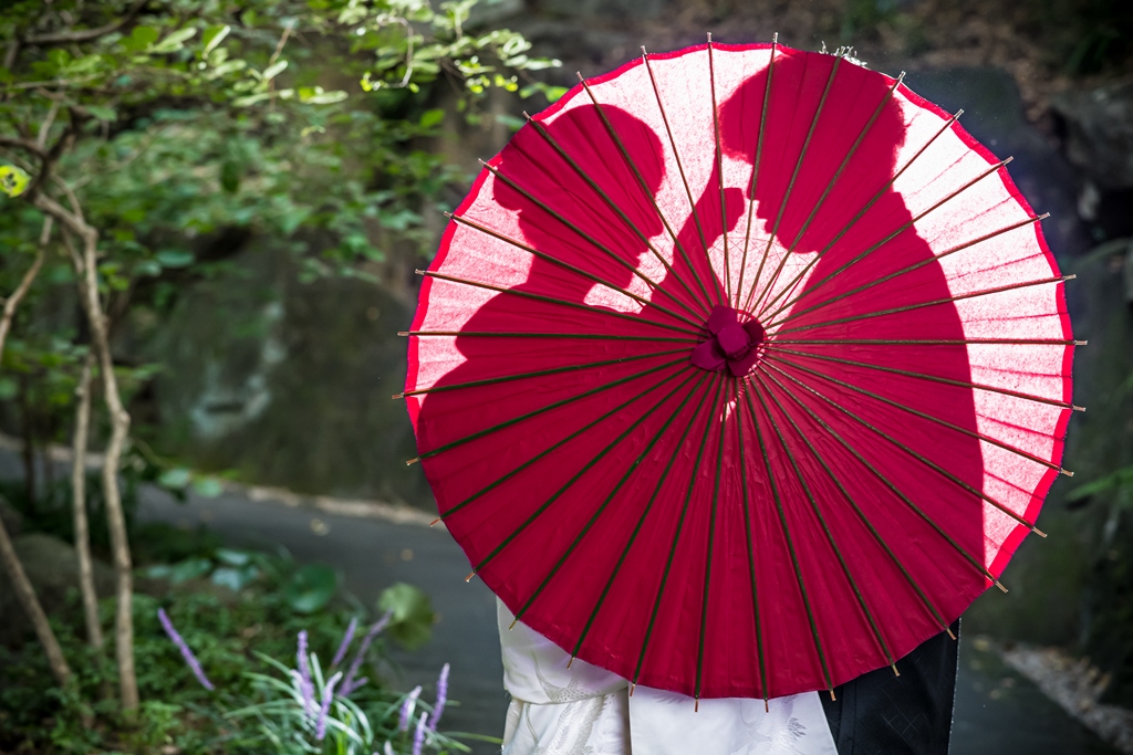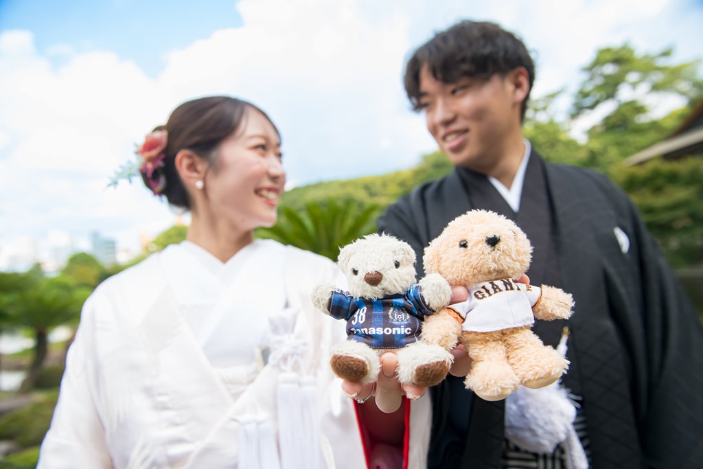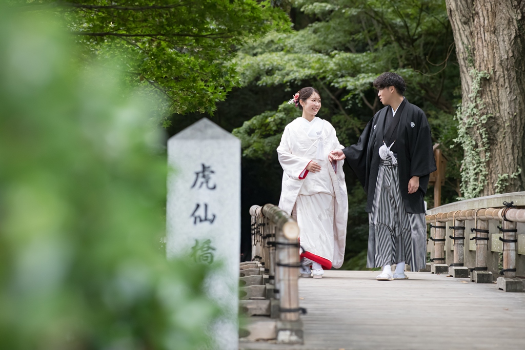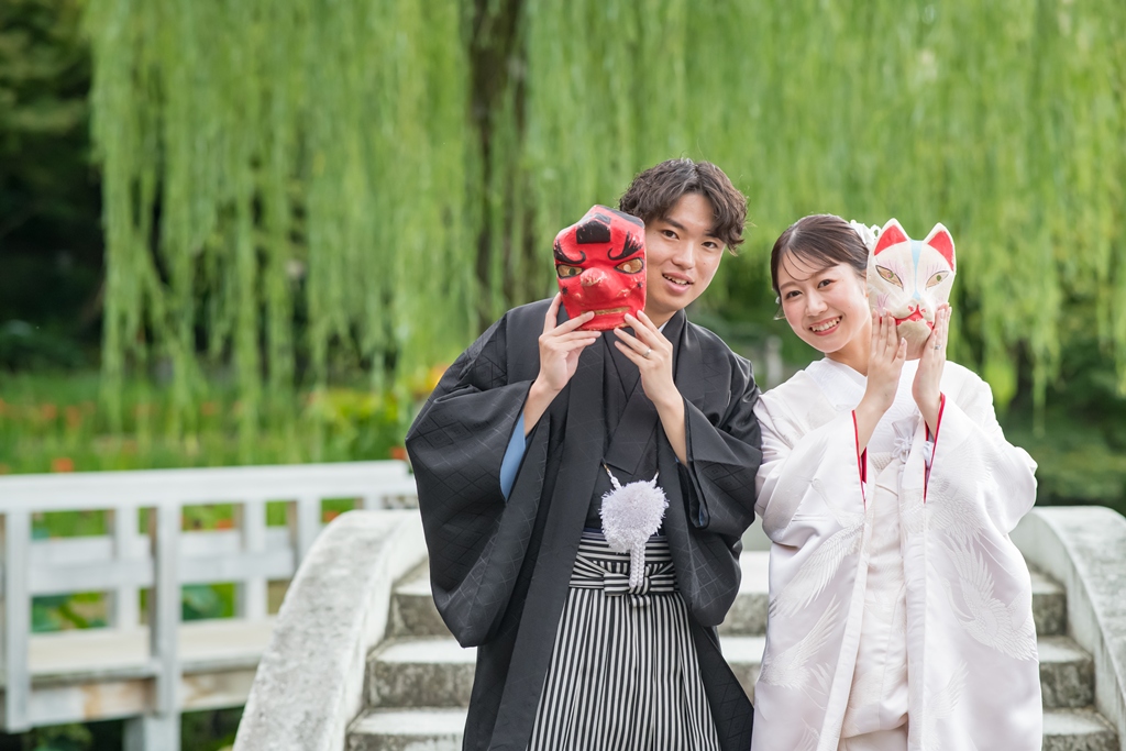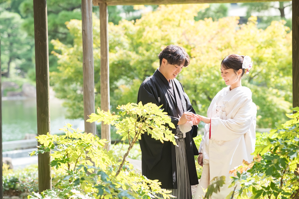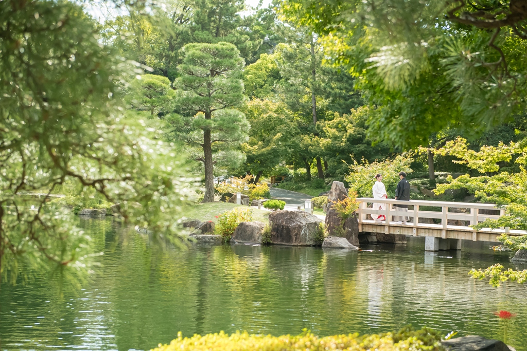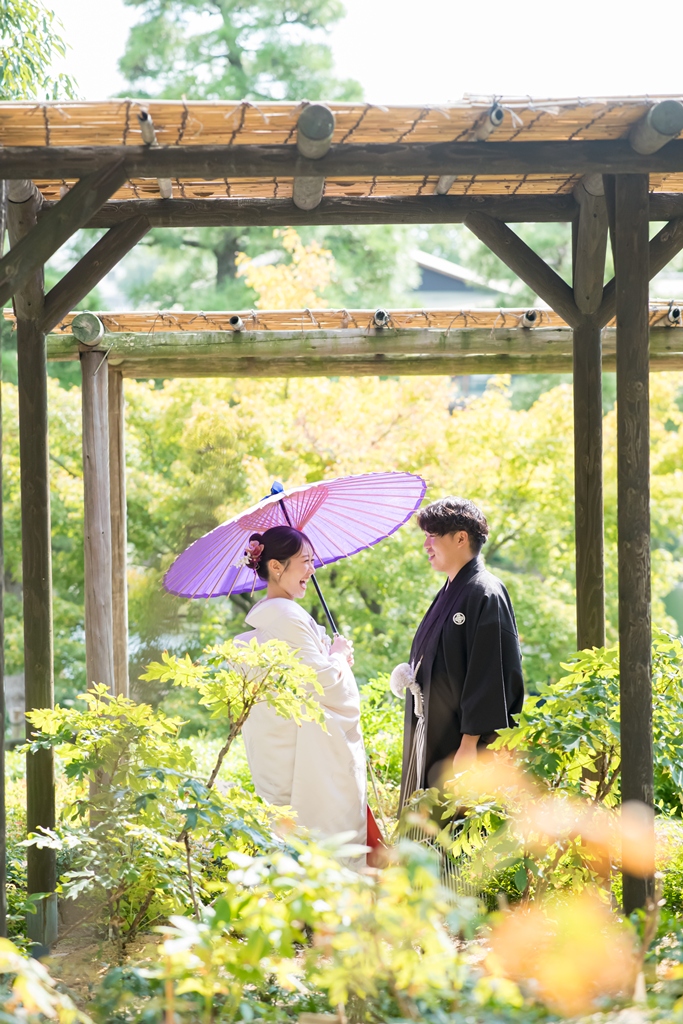 黒門の重厚さや龍門の滝の力強い流れ、澄んだ水辺に映る自然の光が、おふたりの特別な一日を上品に引き立ててくれました。撮影当日、和装ならではの気品をまとったおふたりが庭園内を歩くたびに、周囲の景色がまるで絵巻物のように表情を変え、スタッフ一同、胸が熱くなる思いでシャッターを切っておりました。